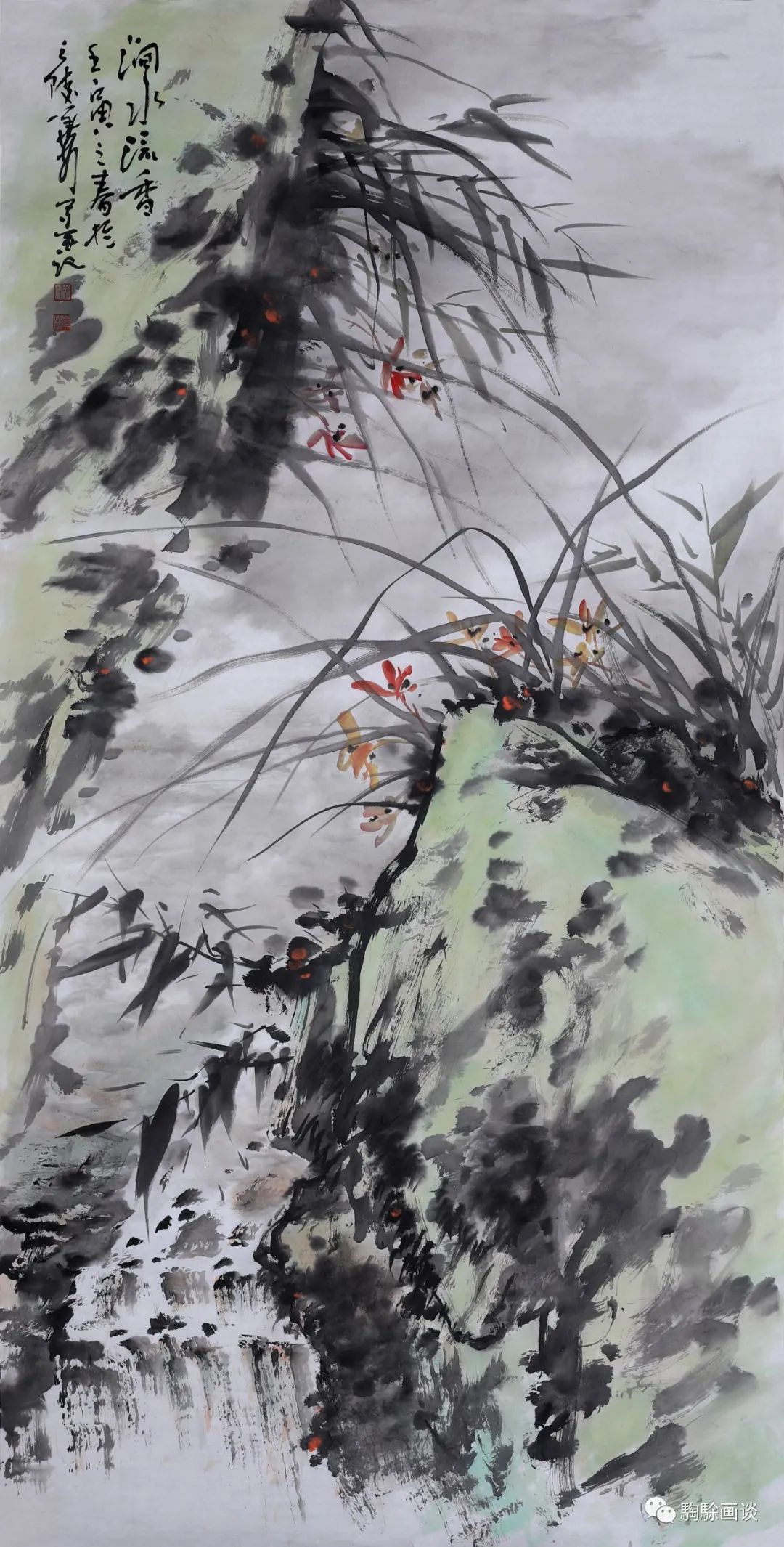 在“國(guó)畫現(xiàn)代化”的探索路徑中,山水畫與花鳥畫的結(jié)合無(wú)疑提升了筆墨的表現(xiàn)力度,寫意花鳥畫家潘天壽、工筆花鳥畫家田世光等皆曾進(jìn)行過(guò)創(chuàng)作實(shí)踐,在選題與風(fēng)格、技法與內(nèi)容表現(xiàn)上展現(xiàn)出新國(guó)畫藝術(shù)的審美品質(zhì)及時(shí)代融入。吳華林的作品《澗水流香》即將蘭草置入云霧彌漫、清溪潺潺的幽谷之中,從畫面情境的塑造上烘托出蘭花的人文氣質(zhì)。畫面山石交錯(cuò)間展現(xiàn)出粗放的筆意及清潤(rùn)的色調(diào),與蘭草勁挺而略顯含蓄的風(fēng)格形成對(duì)比。與此同時(shí),云氣的塑造則較為婉約,豐富了畫面的視覺層次及整體氣氛。跋文“澗水流香”經(jīng)過(guò)精心的構(gòu)思,畫家以水流的運(yùn)動(dòng)及聲形搭建時(shí)空維度,遠(yuǎn)景的霧氣朦朧,虛化手法讓人仿佛沉浸在“幽谷蘭香”的清凈之趣中。正如同齊白石的作品《蛙聲十里出山泉》,構(gòu)圖中雖然不畫青蛙,但卻通過(guò)小蝌蚪的形象,將“蛙聲”與“出山泉”進(jìn)行文學(xué)的意象重構(gòu)。以此類比,雖然畫家無(wú)法直觀刻畫出“蘭香”,但卻能夠通過(guò)溪流將山谷中令人陶醉的景象帶入觀者的想象空間。