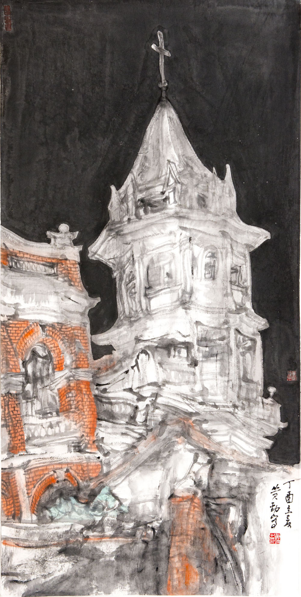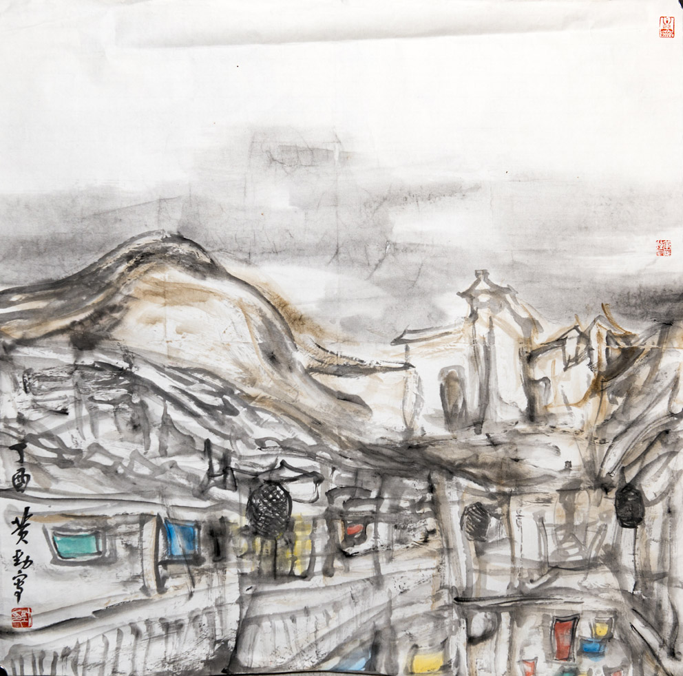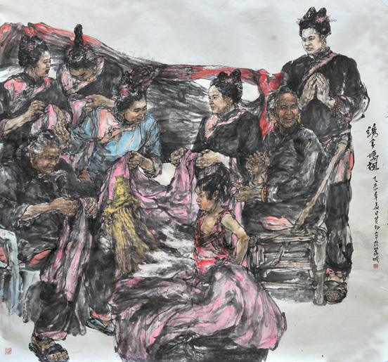 作為長(zhǎng)期任教于地方高等院校美術(shù)教育專業(yè)的一名教師,我在人物、山水和花鳥(niǎo)的寫(xiě)生課教學(xué)上,尤其注重地域題材與人文內(nèi)涵的關(guān)聯(lián)性研究。如見(jiàn)莆田媽祖宮廟繡品以紅色底布為原料,通過(guò)剪切,拼裁,縫制,刺繡等技藝制作而成。筆者構(gòu)思創(chuàng)作了較大尺幅的《繡金媽祖》,以漁女刺繡活動(dòng)為主題,紅色為基調(diào),使人物形態(tài)的思想深度、表現(xiàn)力度和視覺(jué)效果得到充實(shí)和超越,充分發(fā)揮彩墨畫(huà)中色彩與水墨關(guān)系,不僅表現(xiàn)出“湄洲女”文化中的“大愛(ài)”之美,也形象地體現(xiàn)出繡金媽祖像的理想宗旨,冀望給閩臺(tái)兩岸和世界許多地區(qū)的媽祖信眾帶去福音。另外,以閩南民居建筑為題材的《紅磚厝系列》,其美學(xué)表達(dá)的出發(fā)點(diǎn)則在于彰顯意匠加工下的借景抒情之美,從深度把握住中國(guó)畫(huà)寫(xiě)生中的觀察題材、選擇提取、形象轉(zhuǎn)化和筆墨表現(xiàn)等的藝術(shù)規(guī)律,抓往八閩地域文化和南洋華僑文化的共同特點(diǎn),來(lái)完成對(duì)題材背后人文意義的象征訴說(shuō)。這些對(duì)繪畫(huà)核心的創(chuàng)作