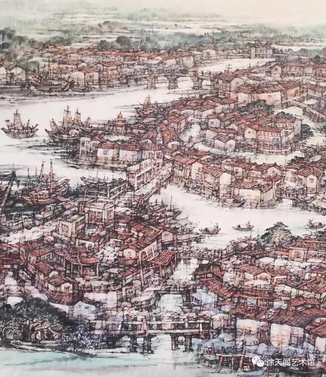 學(xué)仕根據(jù)童年時期的涵江地理位置特點進(jìn)行構(gòu)圖,以咸草頂三角埕為中心,把不同區(qū)域不同年代的地標(biāo)性建筑串在一起,全面反映農(nóng)耕時期商貿(mào)重鎮(zhèn)的真實面貌,表現(xiàn)出享有“小上?!笔⒆u(yù)的繁榮景象。在創(chuàng)作過程中,作者不是單純地對景物生搬硬套, 而是根據(jù)畫面的需要,借用水系穿插變化,豐富畫面的生動性,通過紅磚厝的表現(xiàn)形式,強(qiáng)化古鎮(zhèn)的地域符號,體現(xiàn)出作者既強(qiáng)調(diào)作品的文史價值,也突出作品的藝術(shù)價值的良苦用心。