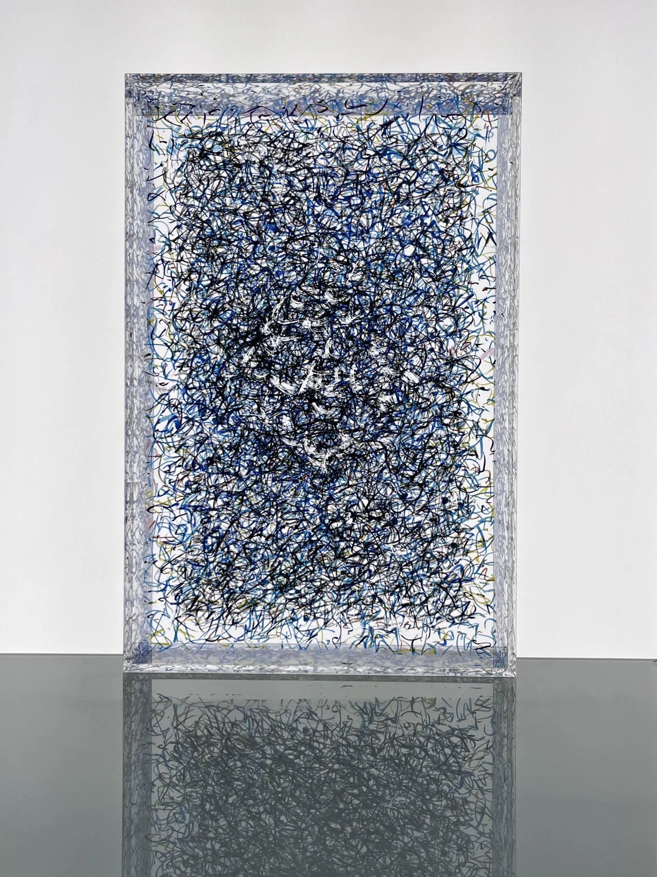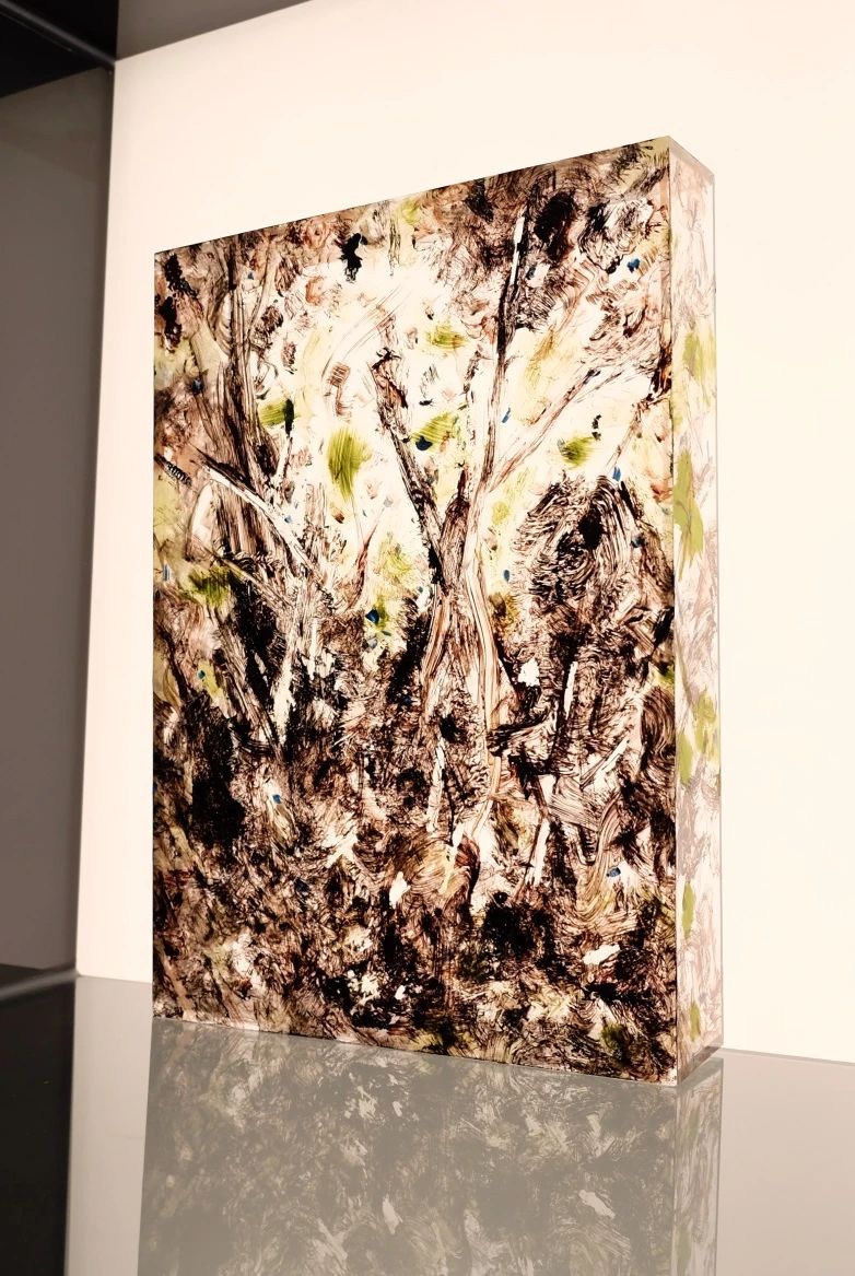 他永遠都在嘗試新的方式與媒介。他開始嘗試直接在透明亞克力上作畫。光滑與透明給他帶來新的觸覺與視覺感受,激勵他用不同于布畫油畫的手法去涂抹、去刮蹭。他取消了畫面的透視與立體法則,因為他意識到材質的透明性本身就是對立體的反動,為什么要將通透覆蓋掉?為什么不能把通透作為畫面的一部分而存在。通透與光影將會重構出新的畫面,且隨著光影的變化而變化。