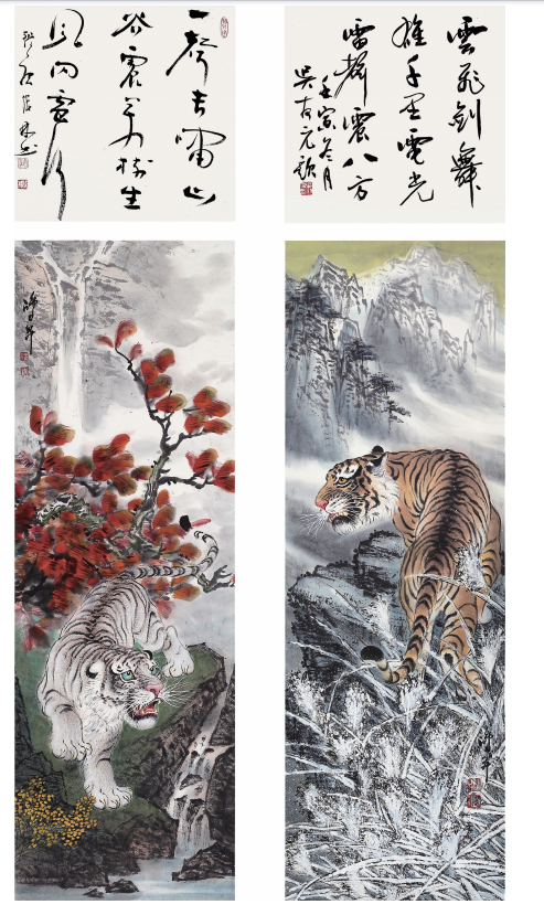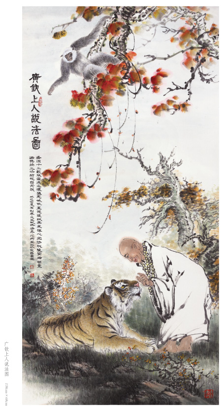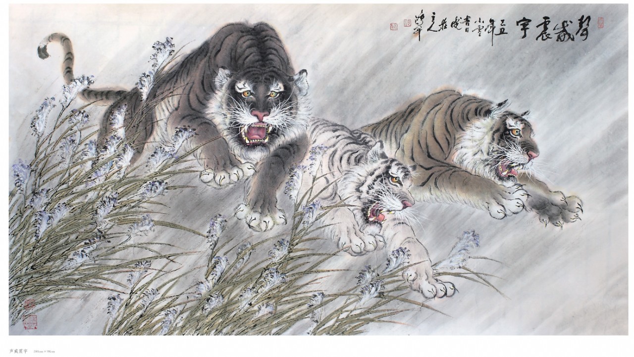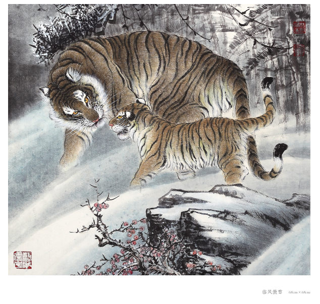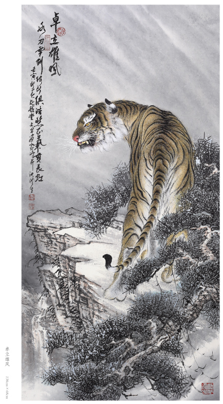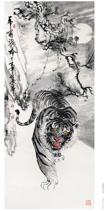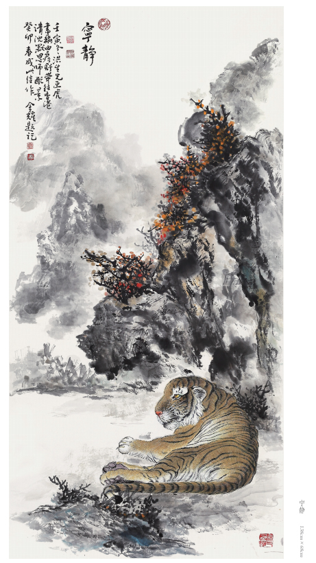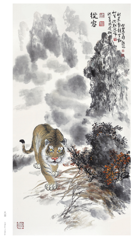 出于真正的愛好而畫畫,只要他喜歡的就認(rèn)真學(xué)、認(rèn)真畫。人物、花鳥、山水,他都畫過,畫虎,更是他所擅長的技藝。在部隊和工廠期間,曾以木刻的形式創(chuàng)作體現(xiàn)主旋律的人物畫,以現(xiàn)實生活題材為主,以表現(xiàn)時代精神為主題,士兵、工人是其畫作中的主要藝術(shù)形象,造型以寫實手法為主。這個畫風(fēng)也延伸到他的中國畫創(chuàng)作,他的花鳥主要采取小寫意畫風(fēng),造型栩栩如生,在形似的基礎(chǔ)上追求神似。他筆下的老虎刻畫精細(xì)、形象逼真,同時,他又注重中國傳統(tǒng)繪畫的詩意表現(xiàn),老虎或在山林云水間盡情奔騰狂嘯、或閑庭信步、或傲視茫茫云海,情感深厚而又充滿驍健和自然的活力,令人精神振奮、豪情滿懷。