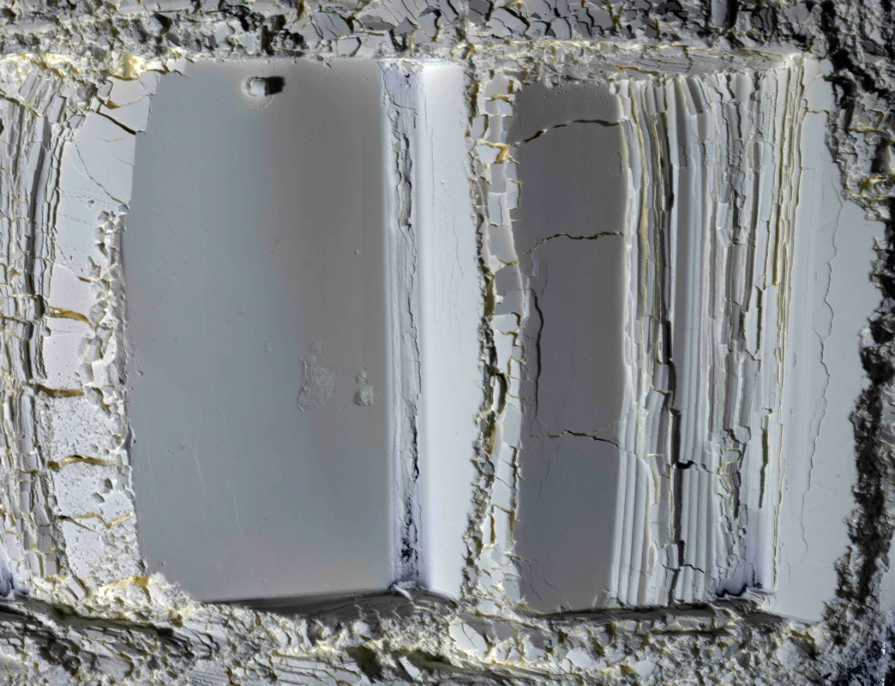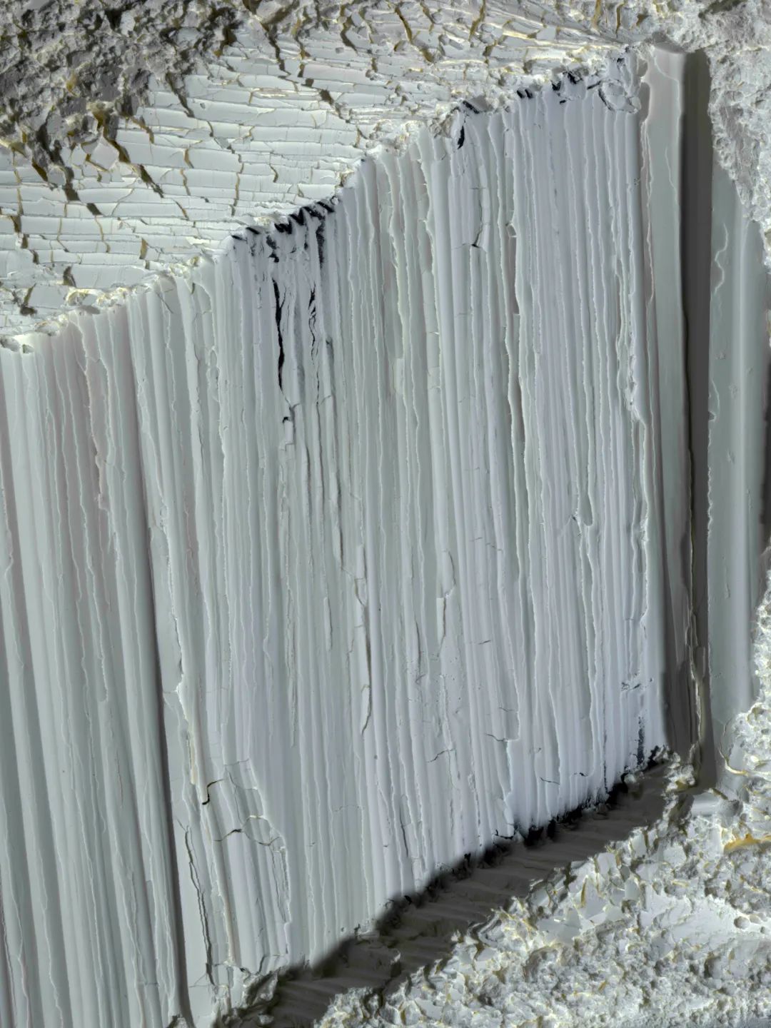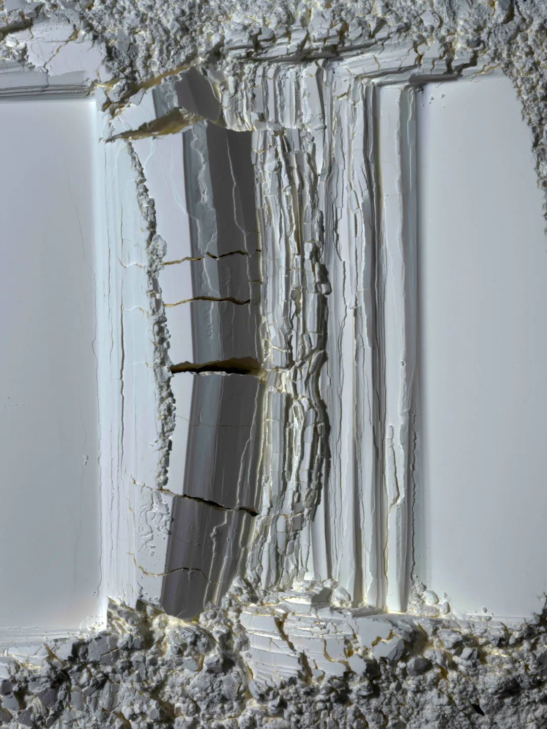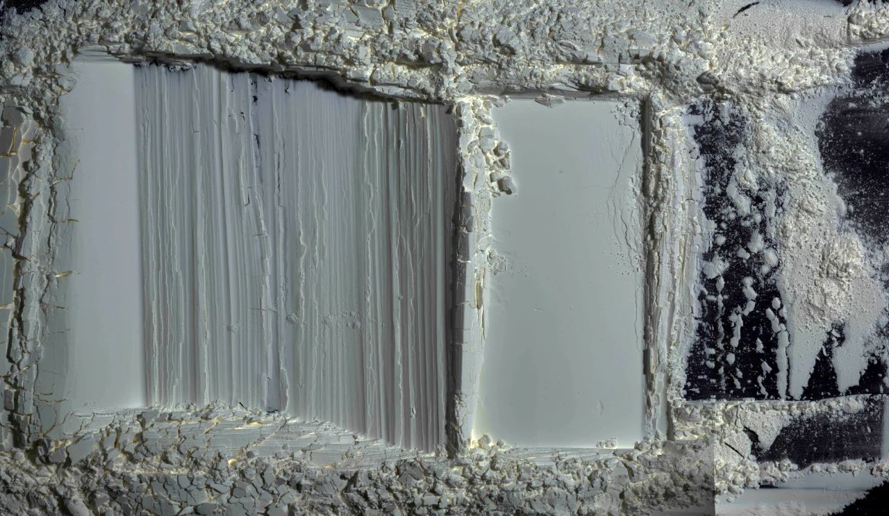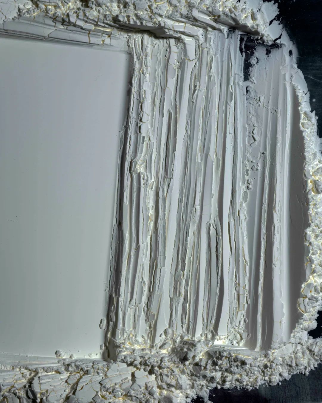 在平面照片上帶來的特殊的立體感,每一個暗部的細節(jié)都異常了得,而且作品足夠大,明暗又如此獨特,形成了陰影的呼吸,虛影的呼吸藝術!而從影來造物,從虛影中造物,這才是中國藝術的秘密!這是虛影的現象學,在光影,凸凹,靈魂,呼吸,恍惚,反轉的對比中,白紙成為了金子,獲得了晶體的強度與硬度。因此,這些作品,要求我們與虛影一道思考,去傾聽圖像的聲音,跳動與呼吸,但這些凸凹起伏的圖像,卻四不像,似是而非,但又反轉,以虛影接納了一切。此宇宙的皮膚與世界的皮膚,也是黑夜與光明一道呼吸的皮膚,是靈光蛻變之后的永恒皮膚。