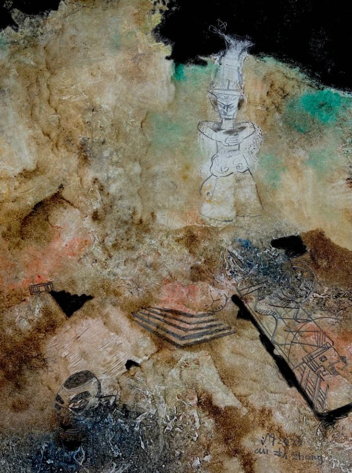畫家不是歷史學家,但可以用他的頓悟、直覺、幻象、結構、節(jié)奏、色彩來思考歷史的嬗變和原委。崔治中的這組油畫就是他思考三星堆的形象表達。也許,這組畫將具象與抽象玩到筆墨線條紊亂如麻如夢如瀾,不易看懂。其實,這夢幻的畫風思絮正是崔治中的遐思與別解。