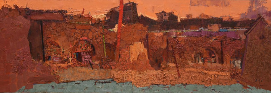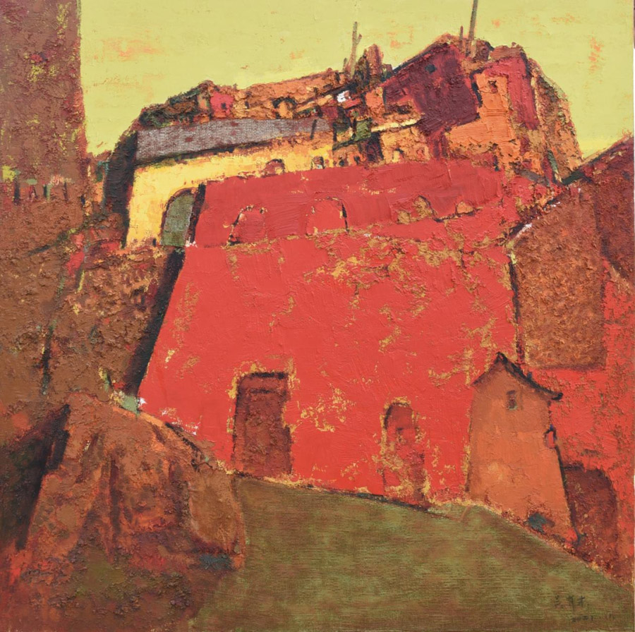 畫面紅黃的組合強調(diào)其結構的塊面感,又厚實堆疊起的山巒是有才近期給我最深的感覺,作品的結構在不斷地變化。情境的轉變勢在必得他將日趨走向成熟,他擺脫模塊中程式走向自然,在更自由地發(fā)揮著繪畫語言的獨特魅力,能從眾多的寫實繪畫中汲取經(jīng)驗得以提煉他的造型、色彩與畫面多層的復疊和凸顯出他有意無意在擺脫傳統(tǒng)繪畫的苦澀走向更重精神的寫意油畫風格的表現(xiàn)形式,這使其作品充滿生機盎然的當下氣息,這種藝術表現(xiàn)更具有直接性和當代性。