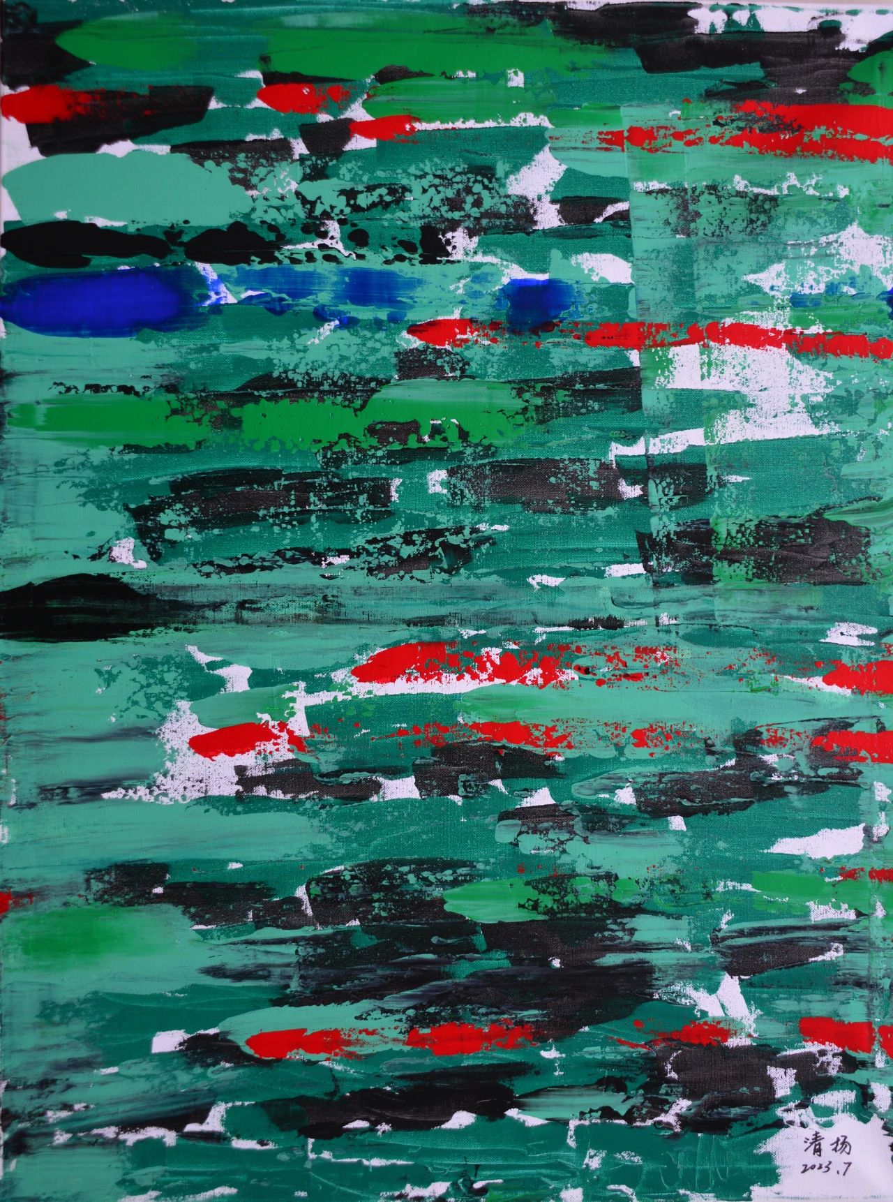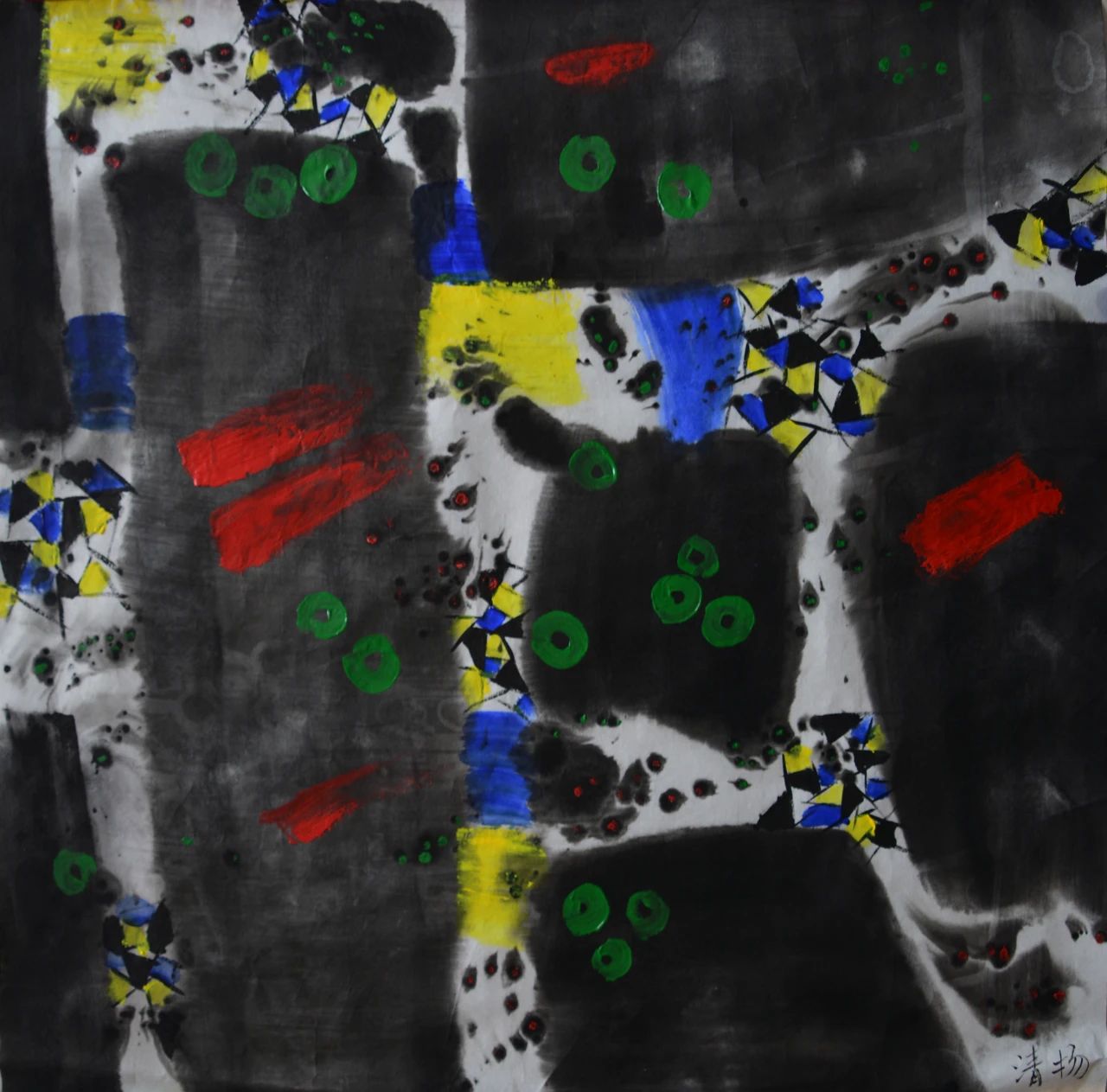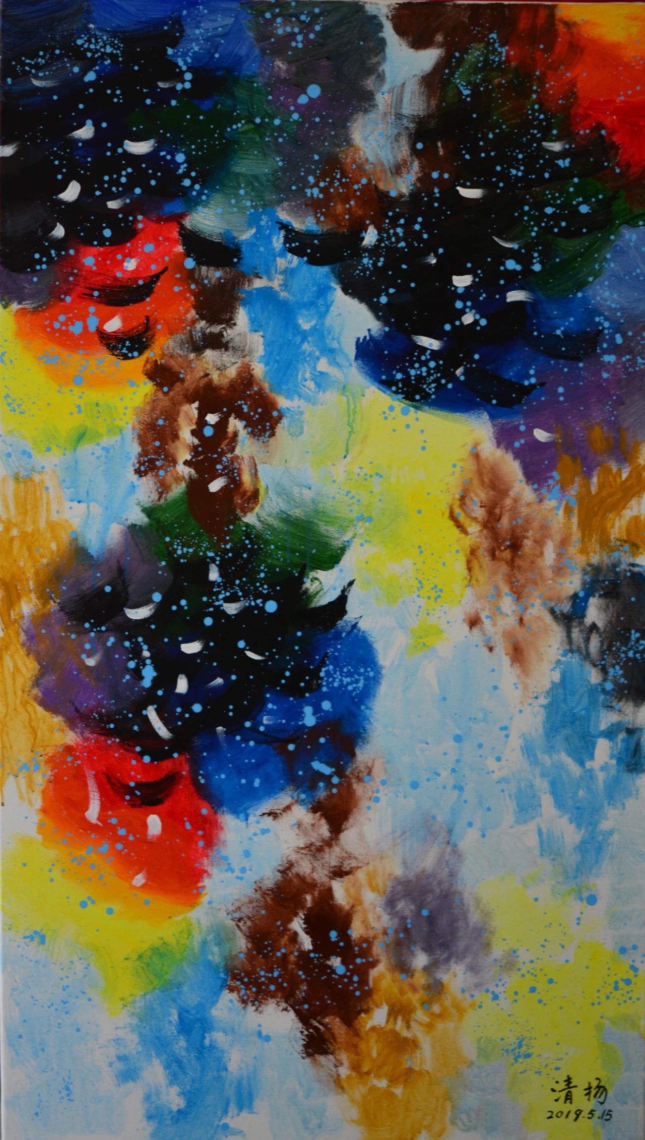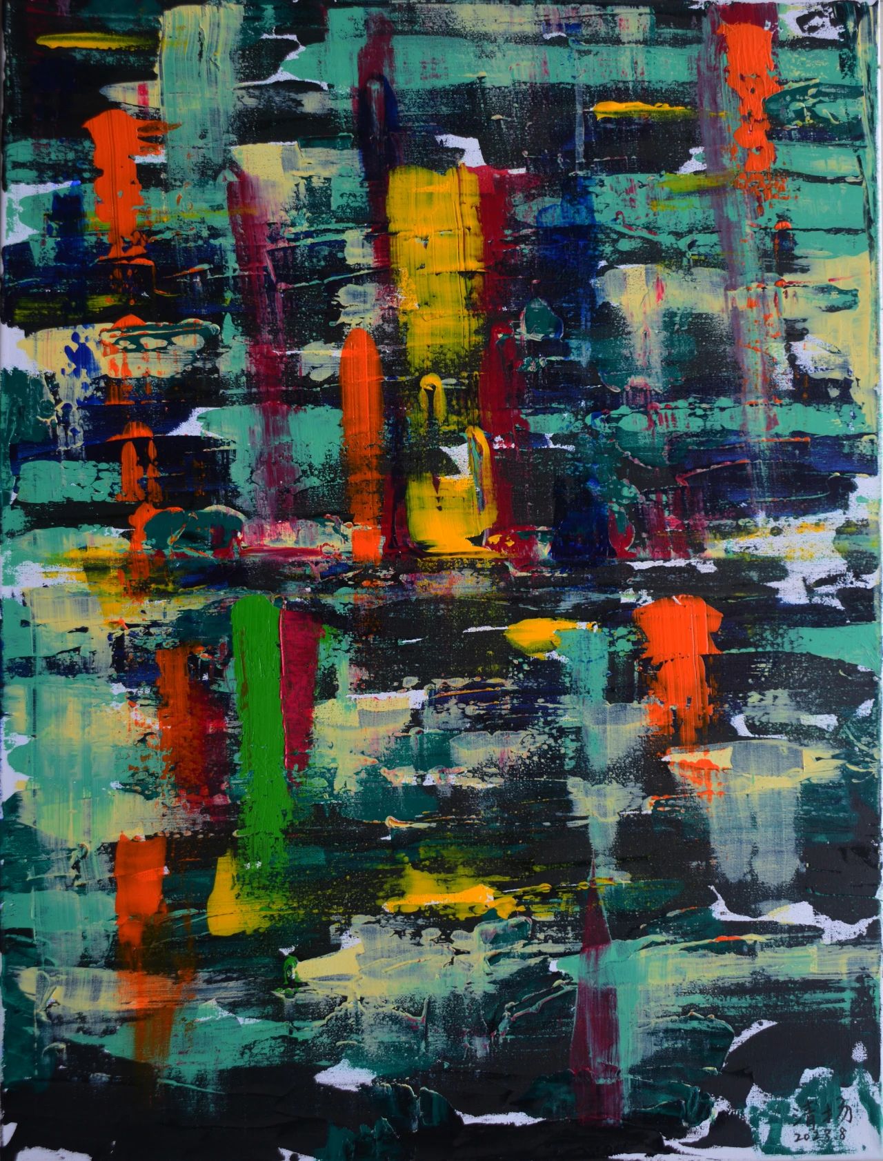 答:我的抽象畫以水彩抽象和丙烯抽象為主。原來我畫水墨抽象,1999年夏天,看到我國水彩畫家寧泓麟老師畫一幅水彩風景畫,被水與色的交融所吸引。當時我正研究抽象,想丙烯和水彩道理是一樣的,抽象一定效果不錯,就試了試。在水的作用下,顏色出現(xiàn)了神奇的效果。不過,感覺很難控制畫面。從畫面濕水到畫面干燥,只有7、8分鐘的時間。在這么短的時間內要考慮構圖、色彩搭配、黑白灰、筆觸與肌理,難度極大。通過反復試驗,掌握了一定的技巧。