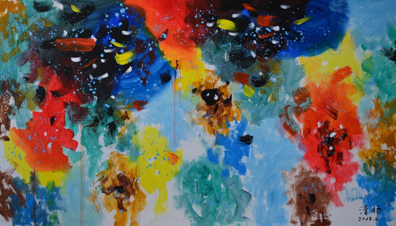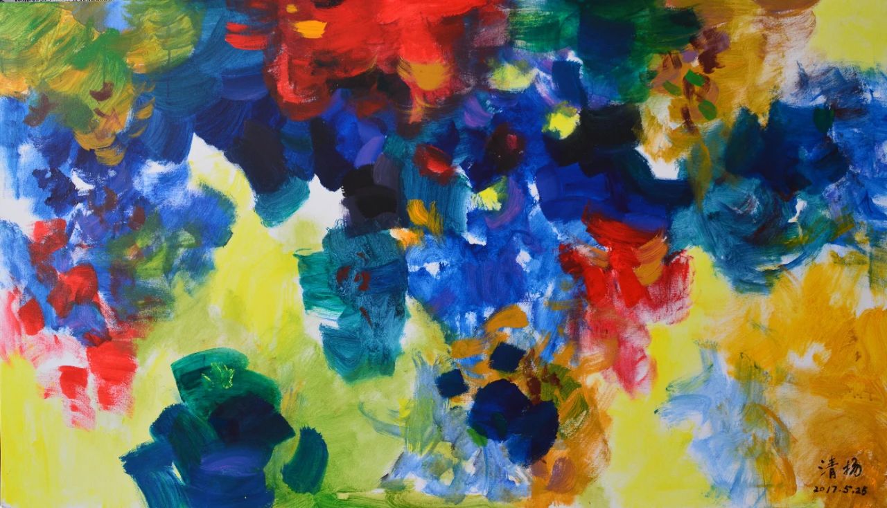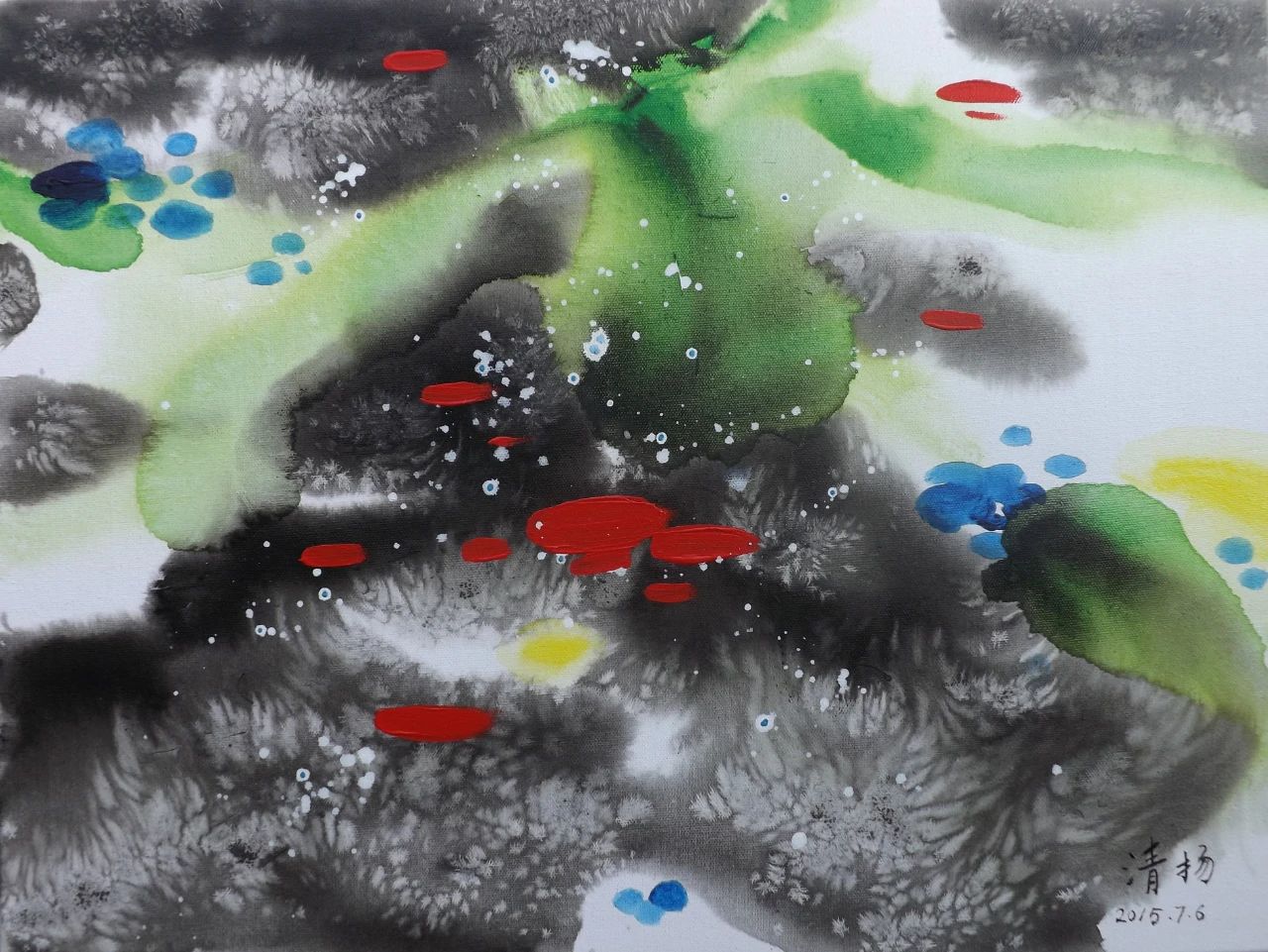 答:我的抽象畫以水彩抽象和丙烯抽象為主。原來我畫水墨抽象,1999年夏天,看到我國水彩畫家寧泓麟老師畫一幅水彩風景畫,被水與色的交融所吸引。當時我正研究抽象,想丙烯和水彩道理是一樣的,抽象一定效果不錯,就試了試。在水的作用下,顏色出現(xiàn)了神奇的效果。不過,感覺很難控制畫面。從畫面濕水到畫面干燥,只有7、8分鐘的時間。在這么短的時間內要考慮構圖、色彩搭配、黑白灰、筆觸與肌理,難度極大。通過反復試驗,掌握了一定的技巧。