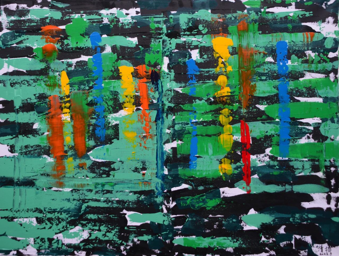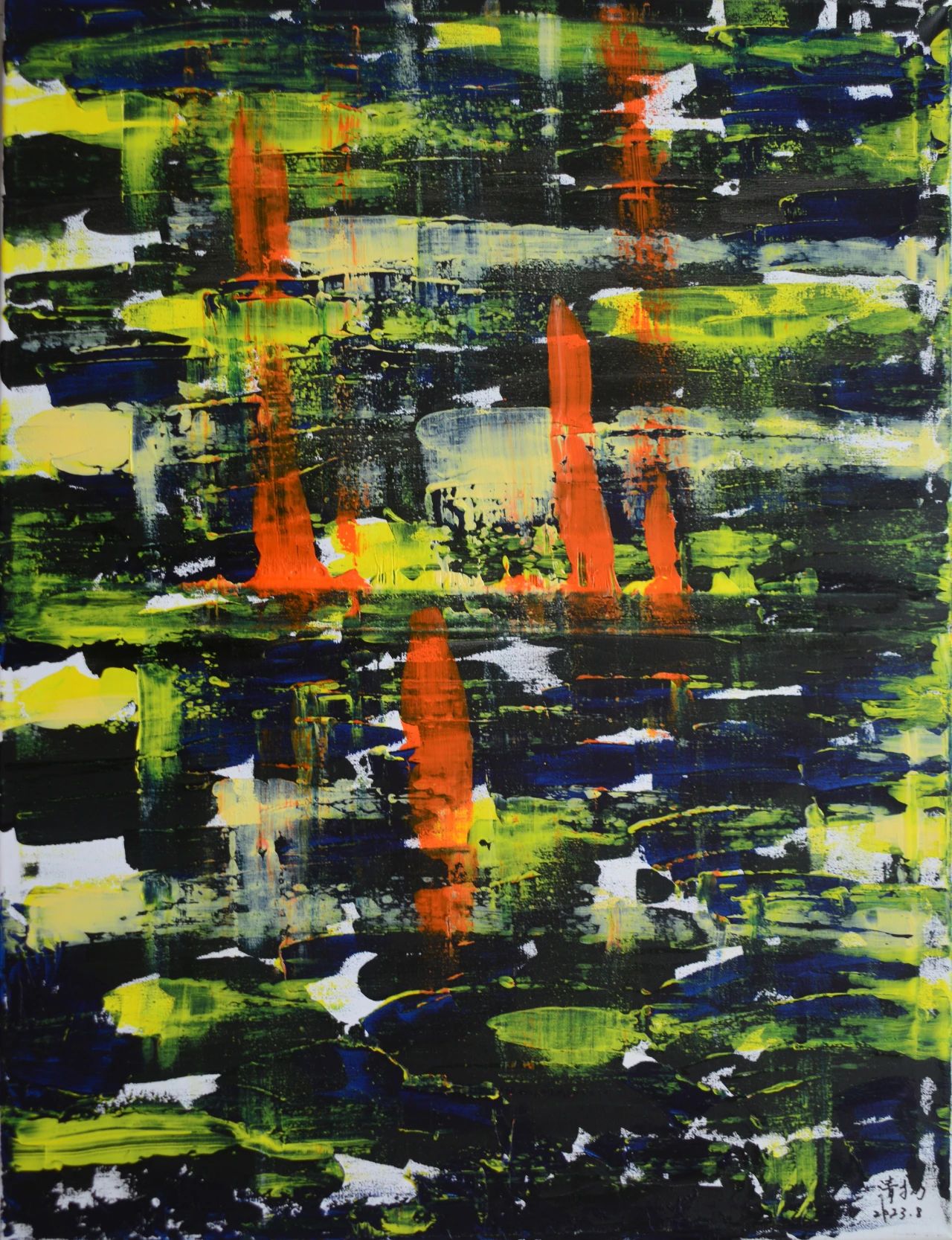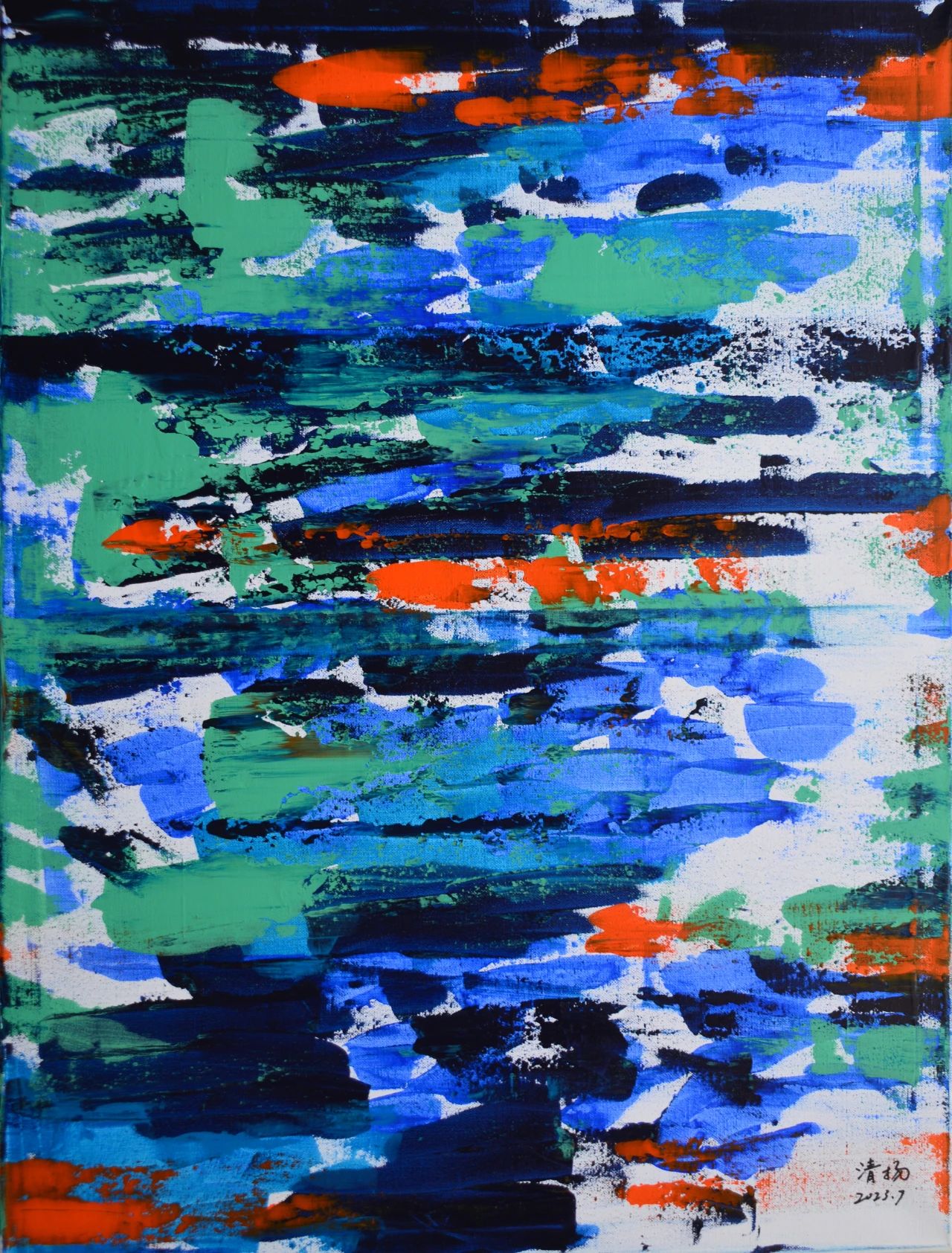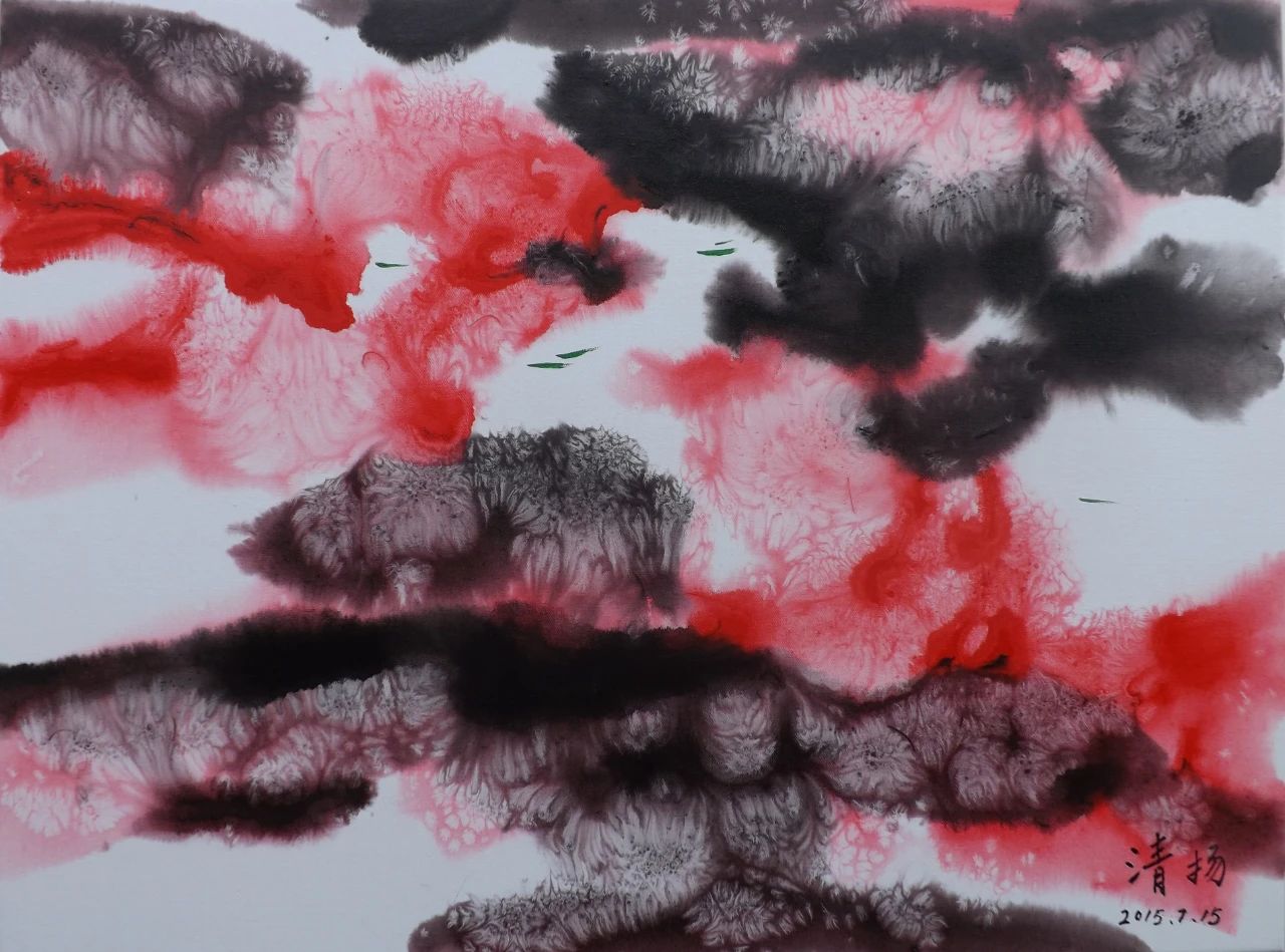 答:我的抽象畫以水彩抽象和丙烯抽象為主。原來我畫水墨抽象,1999年夏天,看到我國水彩畫家寧泓麟老師畫一幅水彩風景畫,被水與色的交融所吸引。當時我正研究抽象,想丙烯和水彩道理是一樣的,抽象一定效果不錯,就試了試。在水的作用下,顏色出現(xiàn)了神奇的效果。不過,感覺很難控制畫面。從畫面濕水到畫面干燥,只有7、8分鐘的時間。在這么短的時間內要考慮構圖、色彩搭配、黑白灰、筆觸與肌理,難度極大。通過反復試驗,掌握了一定的技巧。
