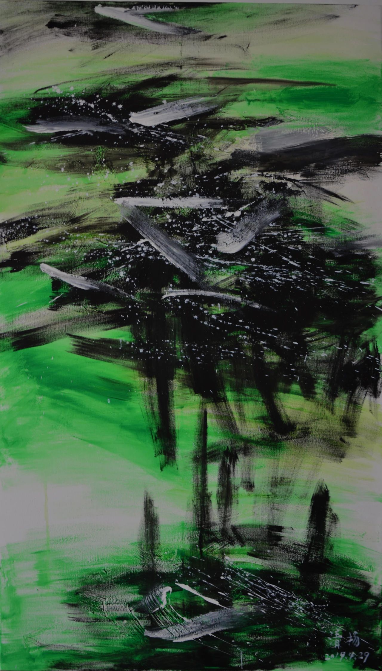 答:我追求下筆的第一感覺。在我看來,抽象是一種需要。在水與色的交融時,畫家的感情得以宣泄。在下筆前,一切感覺都是模糊的,隨著筆觸的積累,抽象的形態(tài)逐漸清晰。我認為在繪畫的初始階段追求意境是很難的,而繪畫的后期是形成意境的主要階段。這個時候用筆既要快,又要準確,是點睛之筆。整個畫面追求語言的醇厚深沉,肌理的斑駁錯綜,布陣的層見疊出,表達的淋漓酣暢。