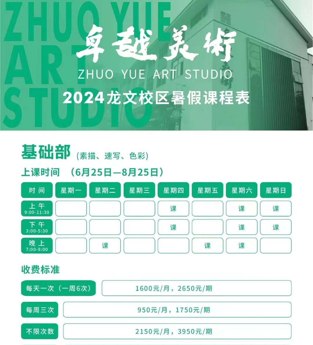 2023年再次升級,成立中心校區(qū),位于民主路與平等路交匯處(國貿(mào)瓏上對面),是漳州市中心新地標(biāo),全新裝修,高端典雅,給予學(xué)生更好的學(xué)習(xí)環(huán)境和交通地段,八卦樓校區(qū)基礎(chǔ)部遷至中心校區(qū),保留少兒部和書法部,中心校區(qū)(總部)開設(shè)基礎(chǔ)部和少兒部,龍文校區(qū)(榮昌)位于新浦路和榮桂路交匯處,地段優(yōu)越,卓越畫室還擁有龍巖校區(qū)、金峰校區(qū)、地質(zhì)人家校區(qū)、藍(lán)田校區(qū)(群芳文體中心)、長泰校區(qū)等,各校區(qū)分層次,分學(xué)科,分班級,因材施教,系統(tǒng)規(guī)范,方便學(xué)生就近學(xué)習(xí),為當(dāng)?shù)靥峁﹥?yōu)質(zhì)學(xué)習(xí)平臺。