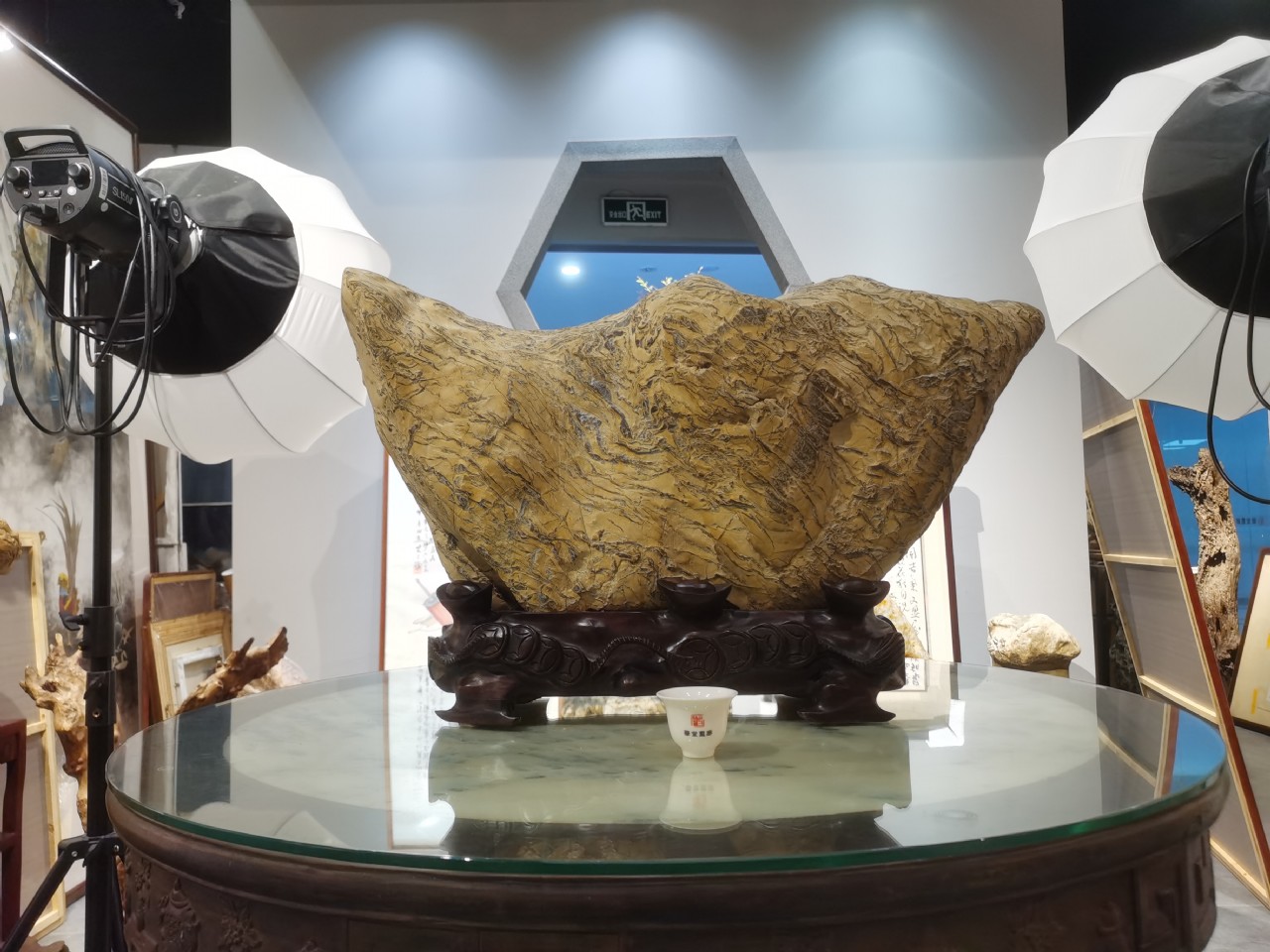 而最精巧和最具爭議的當(dāng)屬小雞出殼,屬于天然瑪瑙奇石。此石似一只色澤淡黃毛茸茸的小雞從蛋殼內(nèi)向外張望伸頭欲出,形象逼真、色澤艷麗,小雞出殼的整體造形以及局部形態(tài)都與實(shí)物相仿,然而業(yè)內(nèi)人士對于其天然屬性卻存在疑問。中華神鷹屬黃龍玉石種,出自廣東紫金南母寺。這是一塊神話傳說中天然形成的奇石,彎彎的鷹嘴、犀利的眼神、線條形神兼似,配上金黃色的玉質(zhì),大小又與真鷹比例一樣,讓人不得不感嘆這大自然的鬼斧神工之作。中國四大奇石都因形神具備才能稱之為奇。