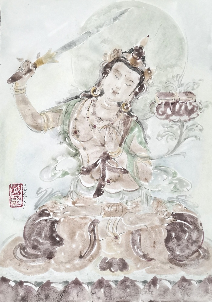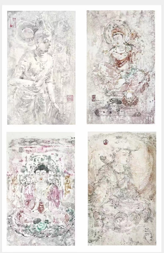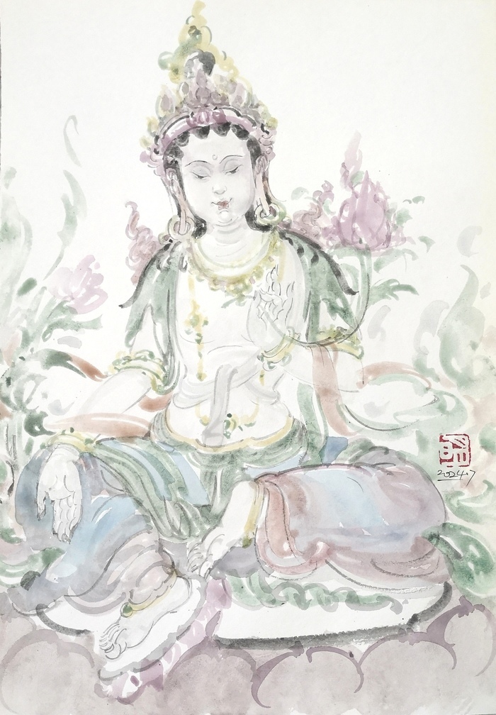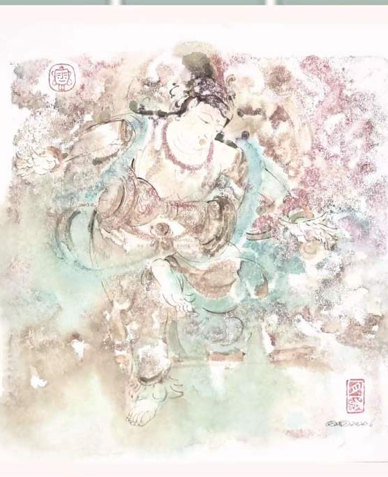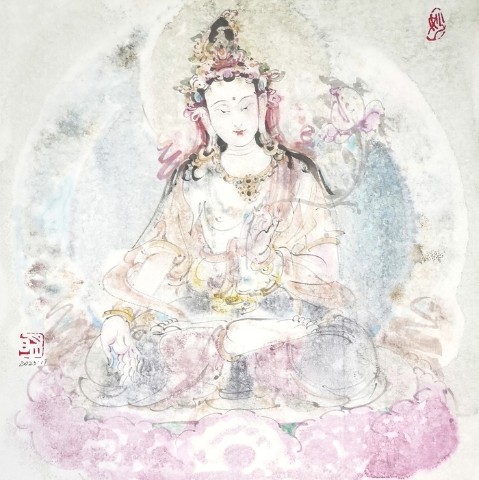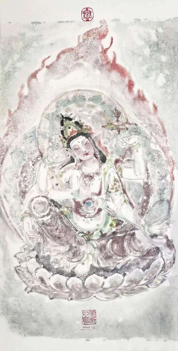 在創(chuàng)作中,張?jiān)旅鞣浅W⒅厝宋餁赓|(zhì)的捕捉和表現(xiàn)。他通過細(xì)膩的筆觸和準(zhǔn)確的造型,將菩薩等佛教人物的形象塑造得栩栩如生,展現(xiàn)出一種超凡脫俗的氣質(zhì)。他不僅關(guān)注人物的外在形象,更注重通過畫面?zhèn)鬟_(dá)出人物的情感和精神內(nèi)涵,這讓他的作品不僅僅是簡(jiǎn)單的形象再現(xiàn),更是對(duì)佛教文化精神和人物情感的深刻詮釋。