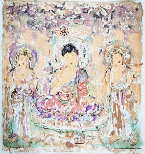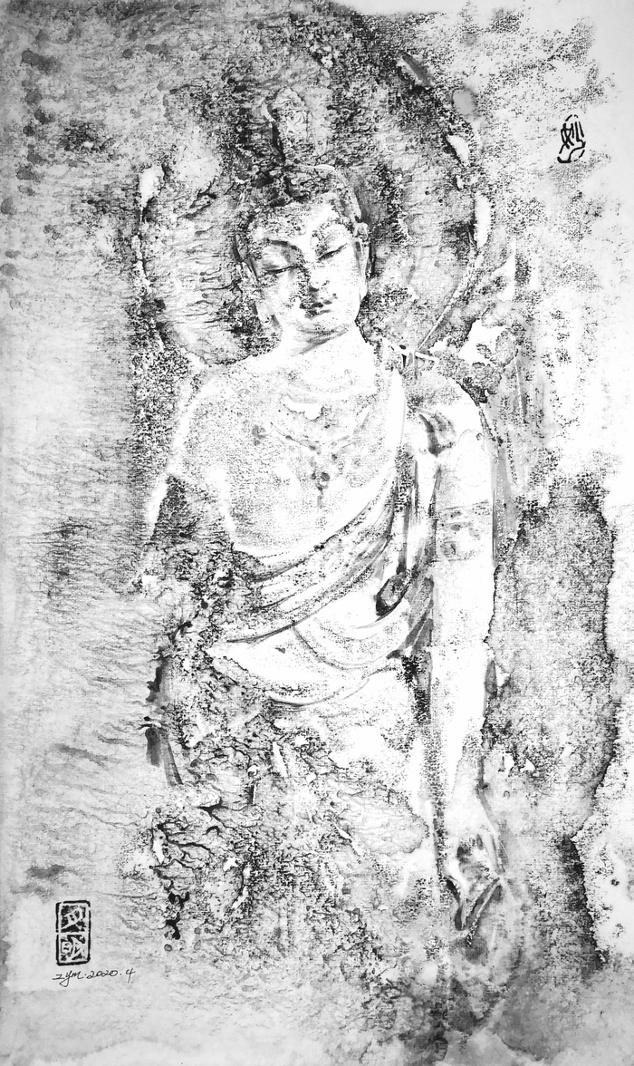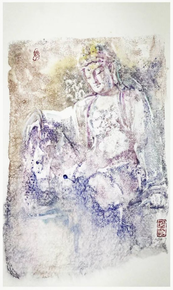 他的繪畫作品不僅營(yíng)造了禪味十足的氛圍,還融入了道法自然的元素,如同逍遙在出世與入世之間,感受到了當(dāng)下的歡喜。他尤其喜歡創(chuàng)作佛教題材的作品,也許是因?yàn)檫@類題材的作品更適合抒發(fā)內(nèi)心的情感,體現(xiàn)出人性本真的簡(jiǎn)單和快樂。在創(chuàng)作中,他將西方繪畫的技法融入中國(guó)傳統(tǒng)藝術(shù)之中,形成了一種簡(jiǎn)潔明快的藝術(shù)風(fēng)格,既具有中國(guó)傳統(tǒng)藝術(shù)的韻味,又不失現(xiàn)代感和藝術(shù)張力。