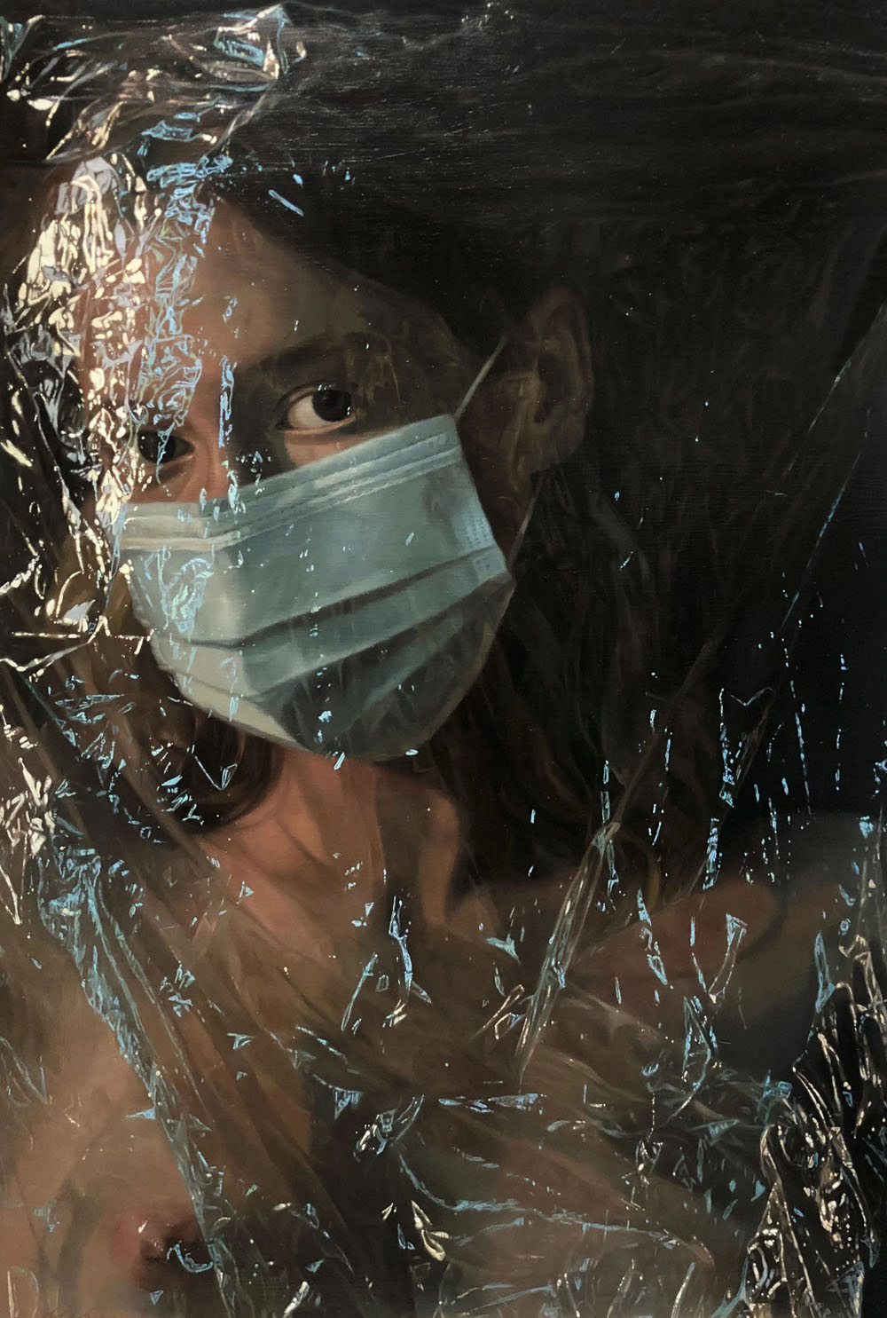 劉昊天的“浮生系列”是其寫實(shí)油畫階段探索的又一全新成果,以“浮生”為主旋律的一批帶有“塑料薄膜”的作品,為我們展現(xiàn)當(dāng)下社會(huì)在飛速發(fā)展之下,人類在大環(huán)境面臨的種種壓力,由之帶來對(duì)于社會(huì)、環(huán)境等問題的思考。有喜有憂,有笑有淚,我們?nèi)缤涣m埃,在宇宙之間如此渺小但又不可替代。浮生若夢(mèng),浮生未歇,人生始終沒有定論,我們可以虛度和享受時(shí)光,進(jìn)而試圖尋找人生真正的價(jià)值。