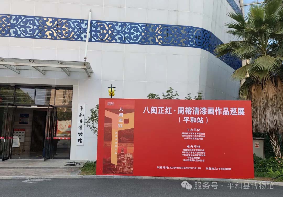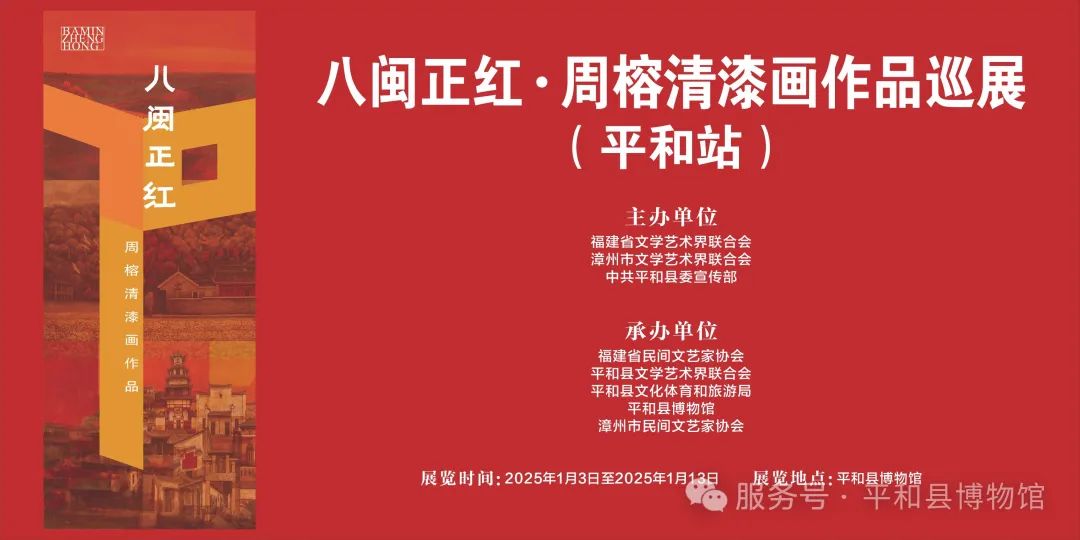 為深入學(xué)習(xí)貫徹黨的二十屆三中全會和習(xí)近平總書記在福建考察時重要講話精神,深入踐行習(xí)近平文化思想,大力弘揚(yáng)紅色文化,由福建省文學(xué)藝術(shù)界聯(lián)合會、漳州市文學(xué)藝術(shù)界聯(lián)合會、中共平和縣委宣傳部主辦,福建省民間文藝家協(xié)會、平和縣文學(xué)藝術(shù)界聯(lián)合會、平和縣文化體育和旅游局、平和縣博物館、漳州市民間文藝家協(xié)會承辦的八閩正紅·周榕清漆畫作品巡展(平和站)在平和縣隆重舉行。