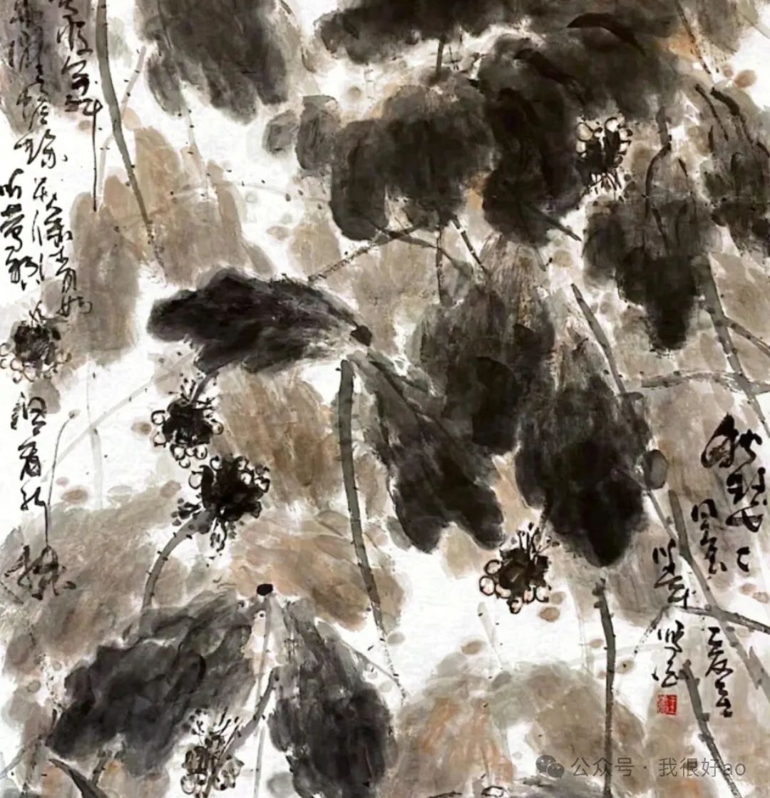 “通過簡單的墨色塑造荷葉的形態(tài),而墨與色的交融碰撞,并非是刻意去營造和精準(zhǔn)的描繪,而是在隨性的筆觸中借助濕潤的條件形成的自然暈染,這種看似“偶然天成”的方式實則是對傳統(tǒng)寫意精神的傳承和創(chuàng)新”
