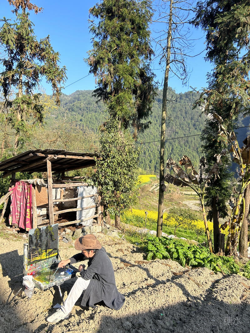 那日自草堂下山采風,暮色漫過山脊時,油菜花田已浸在暗光里。山體在暮色中褪去輪廓,松針在風中颯颯作響,像是用刻刀在暮色里鑿出蒼勁的輪廓。連那片金黃的油菜花都壓低了身段,沉甸甸地墜在天地之間。這畫面像塊生鐵烙進心底,次日寫生時便刻意追著暮色,筆觸如鈍刀劈開混沌,在昏暗里硬生生剖出山體的筋骨、松針的鋒芒,連那片油菜花也化作一塊塊凝固的黃金,在暮色中顯出骨子里的渾厚與蒼勁。
