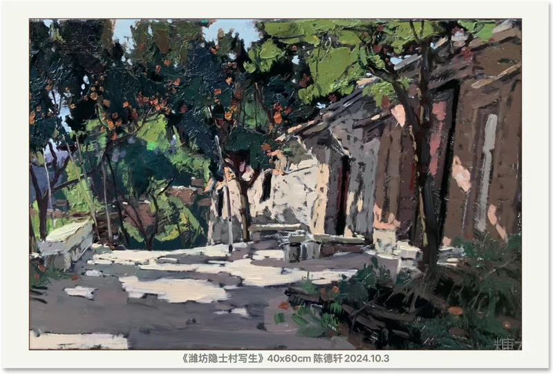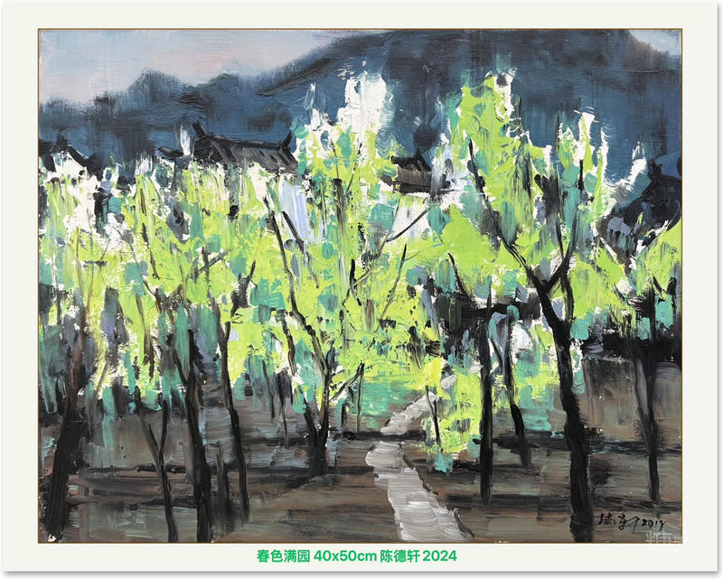 這幅作品畫的是農家門前梨花開的場景。我刻意隱去了農舍的風霜刻痕,把春風的溫柔揉進畫布里——梨花用粉綠、粉紫補色關系弱對比的方式層層堆疊,我努力把整個春天的清冽都凝結在畫里,力求讓每一簇空氣都透著骨子里的干凈。