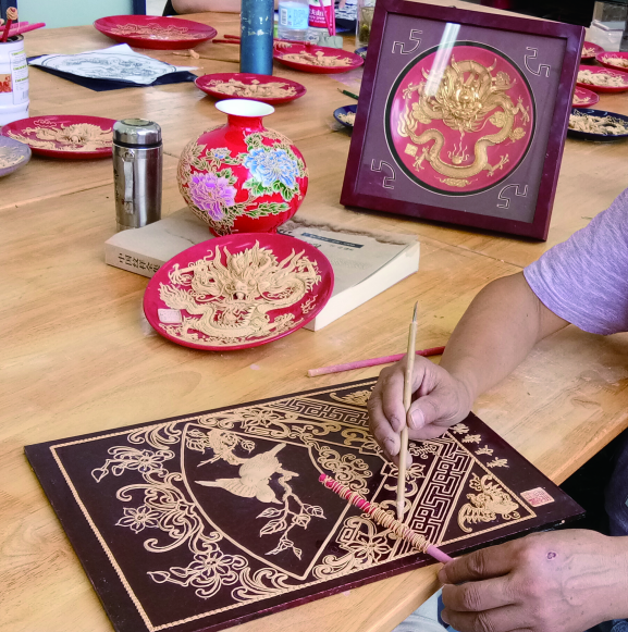 詔安是中國書畫藝術(shù)之鄉(xiāng),美學(xué)思想源遠流長,漆線雕工藝的線條美、色彩美和圖案美與國學(xué)美學(xué)高度契合。其線條精細流暢,如書法筆觸,體現(xiàn)對線條韻律和節(jié)奏的追求。書法講究筆畫變化,漆線雕線條同樣富有藝術(shù)表現(xiàn)力,這得益于藝人高超技藝。