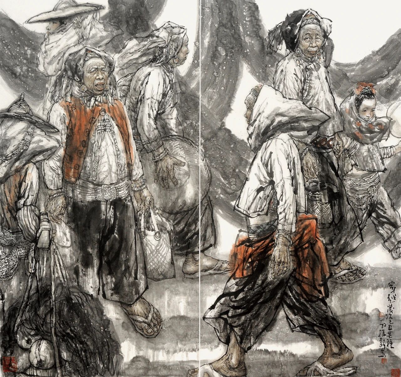 翁:其一,“意”是寫意人物畫的內(nèi)在特質,也是寫意人物畫的核心。寫意人物畫重在傳神寫意,有強烈的抒情性,它不拘泥于諸如比例、透視、結構、解剖、光影、色彩、質地、肌理等的如實描摹,而是特別重視主客觀統(tǒng)一的意象表現(xiàn),即以形寫神,情景交融,調(diào)動包括夸張、變形、取舍、隱喻等各種藝術手段去強化對象的內(nèi)在本質。寫意人物畫也有強烈的創(chuàng)造性。就畫面經(jīng)營來說,是平面空間意識,不受焦點透視和客觀景物的限制,為了表現(xiàn)畫家的思想意圖、審美情趣,甚至可以根據(jù)畫面需要,突破時間空間的制約而進入更為自由的境界。如把不同時間的人物、景物有機地組織在一幅畫面中,或在一幅畫中展現(xiàn)情節(jié)的持續(xù)發(fā)展,不受科學透視的約束,自由而能動地表現(xiàn)對象的形體和空間,而詩、書、畫、印之熔為一爐,又使畫面產(chǎn)生特殊的效果,給人們留下咀嚼、體味的余地。