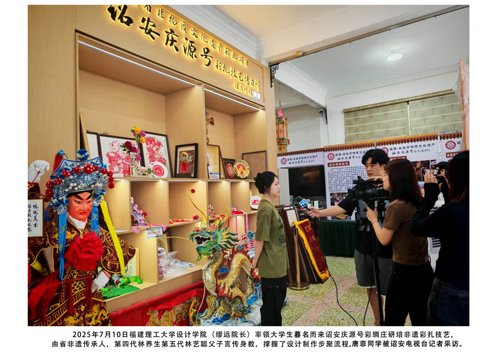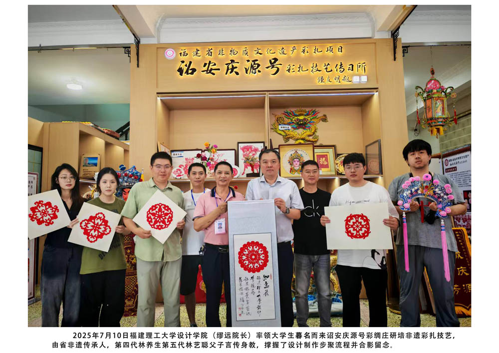 2025年7月10日福建理工大學(xué)設(shè)計(jì)學(xué)院(繆遠(yuǎn)院長(zhǎng))率領(lǐng)大學(xué)生暮名而來(lái)詔安慶源號(hào)彩綢莊研培非遺彩扎技藝,由省非遺傳承人,第四代林養(yǎng)生第五代林藝聰父子言傳身教,撐握了設(shè)計(jì)制作步聚流程并合影留念。