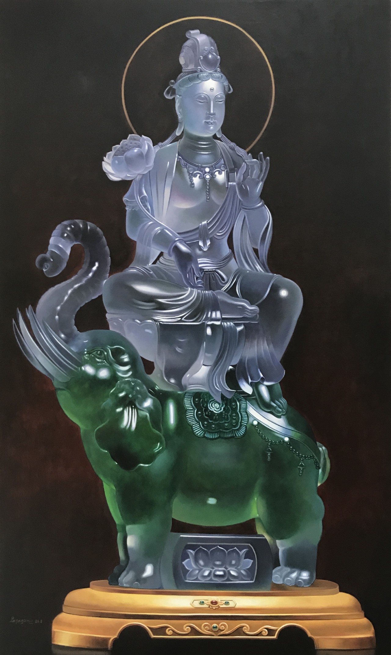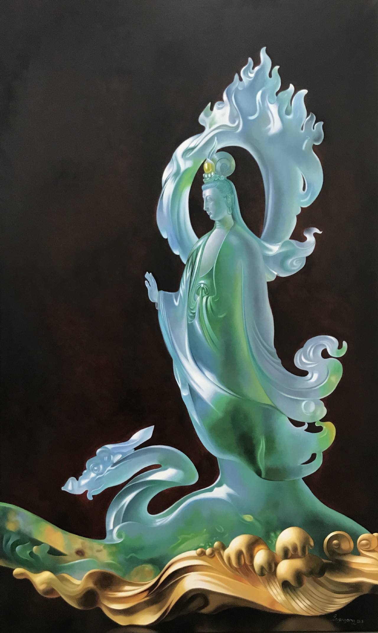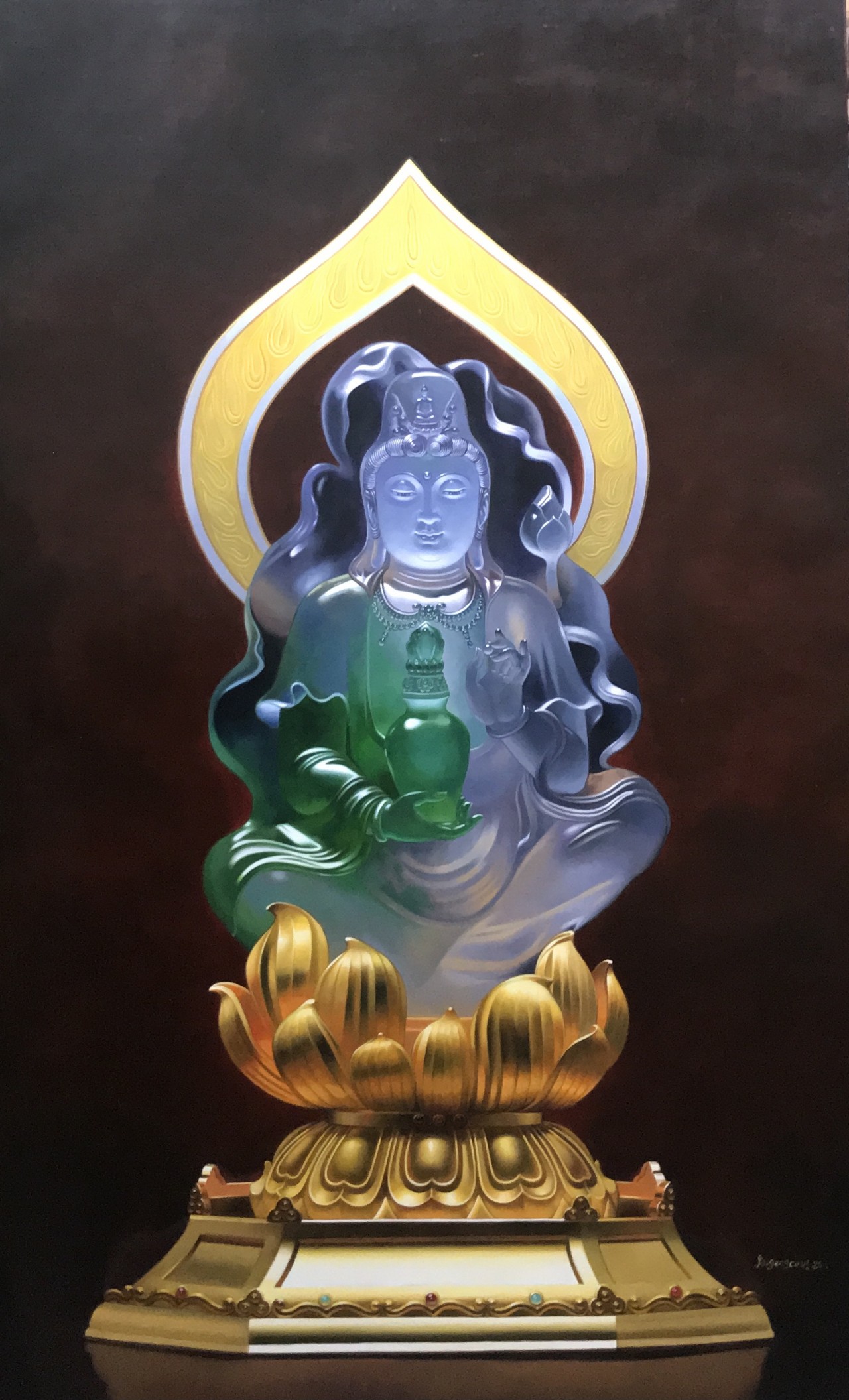 特別是受張大千水墨《翡翠觀音》啟發(fā),在國內(nèi)尚未有人專業(yè)創(chuàng)作寫實(shí)翡翠佛像油畫的情況下,決定深入探索實(shí)踐,成為國內(nèi)專業(yè)、系統(tǒng)創(chuàng)作寫實(shí)翡翠佛像油畫第一人。