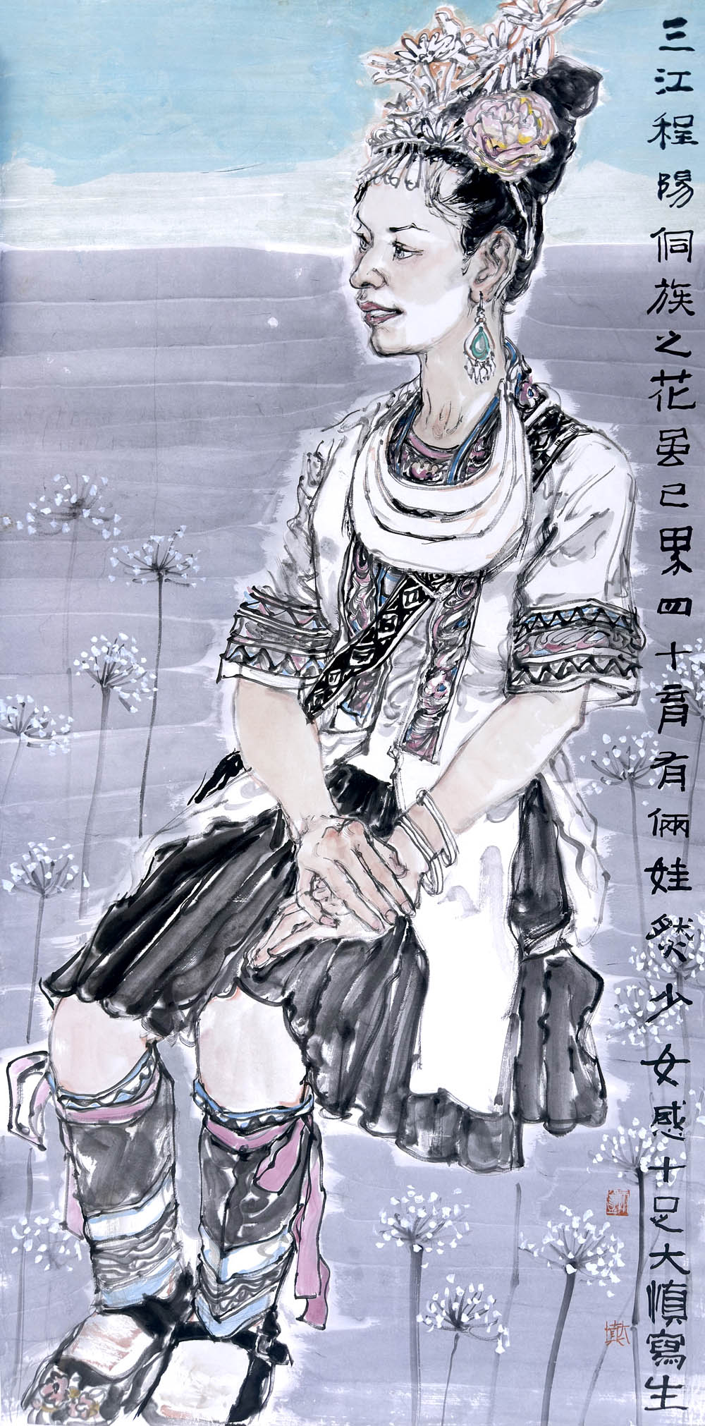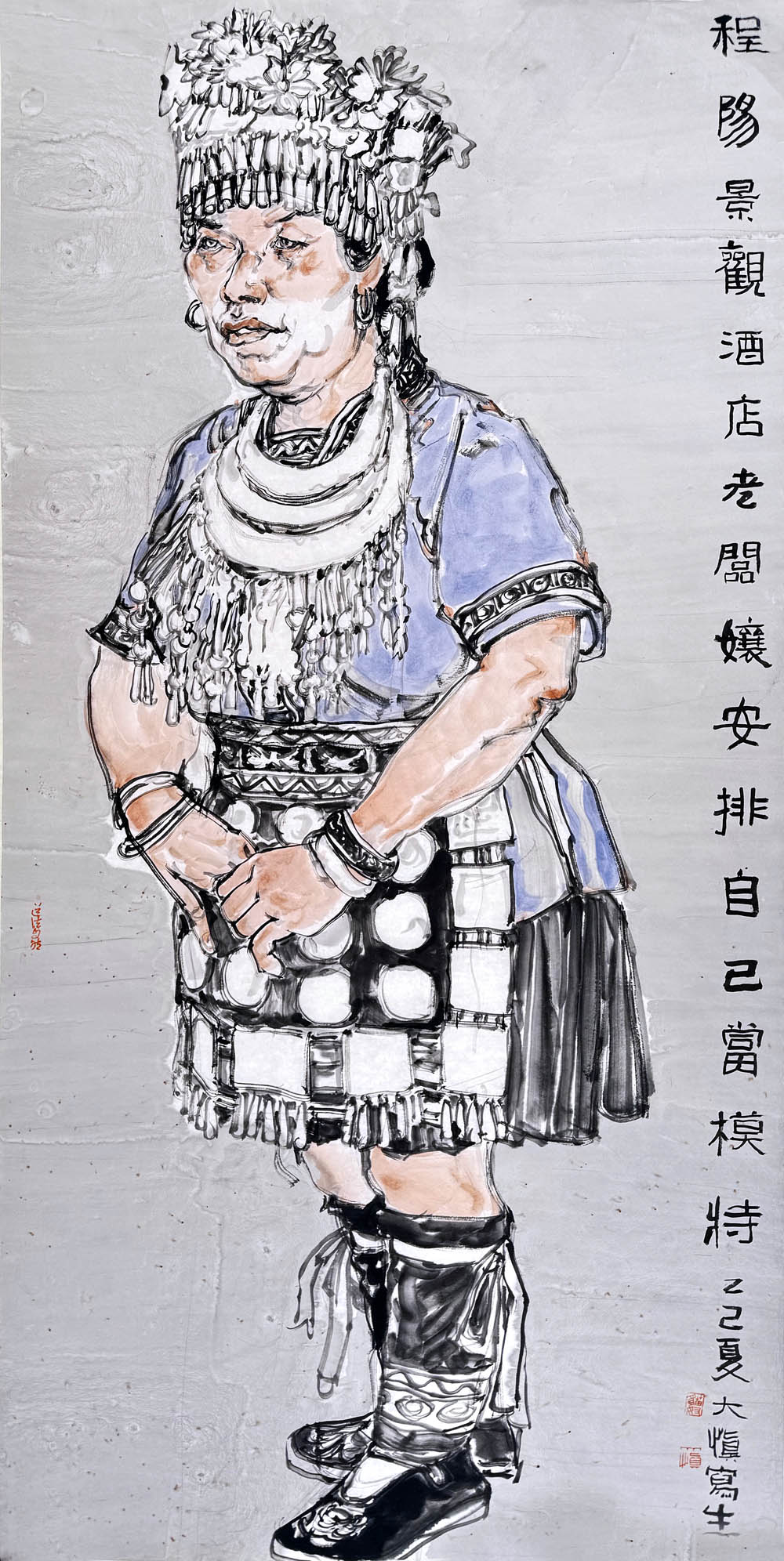 數(shù)字時(shí)代對(duì)于人物寫生存在干擾,矛盾焦點(diǎn)在于存在性的藝術(shù)審美表達(dá)與復(fù)制性的文化工業(yè)符號(hào)之間的矛盾,當(dāng)韓式明星鼻型與眼型泛濫中國(guó)、批量化的AI濾鏡重塑視覺(jué)感知,時(shí)尚的人工美已成為可定制的昂貴商品時(shí),自然美成為我們需要守護(hù)的意義。因此,我們始終堅(jiān)守繪畫的真理本質(zhì),在寫生中過(guò)濾掉那些浮躁的元素,以“對(duì)話”方式深入理解人物內(nèi)在的精神氣質(zhì)。這種筆墨突圍的關(guān)鍵在于找到民族文化基因與當(dāng)代審美意識(shí)的共振點(diǎn)。程陽(yáng)八寨的風(fēng)雨橋給了我重要啟示:這座橫跨林溪河的建筑,既保持著侗族木構(gòu)的榫卯智慧,又在廊柱傾斜角度中呈現(xiàn)現(xiàn)代力學(xué)原理。寫生時(shí),我將橋身的弧線轉(zhuǎn)化為人物衣紋的轉(zhuǎn)折,用淡墨渲染的橋影作為背景,讓身著傳統(tǒng)服飾的人物在現(xiàn)代構(gòu)成的空間里呼吸。
