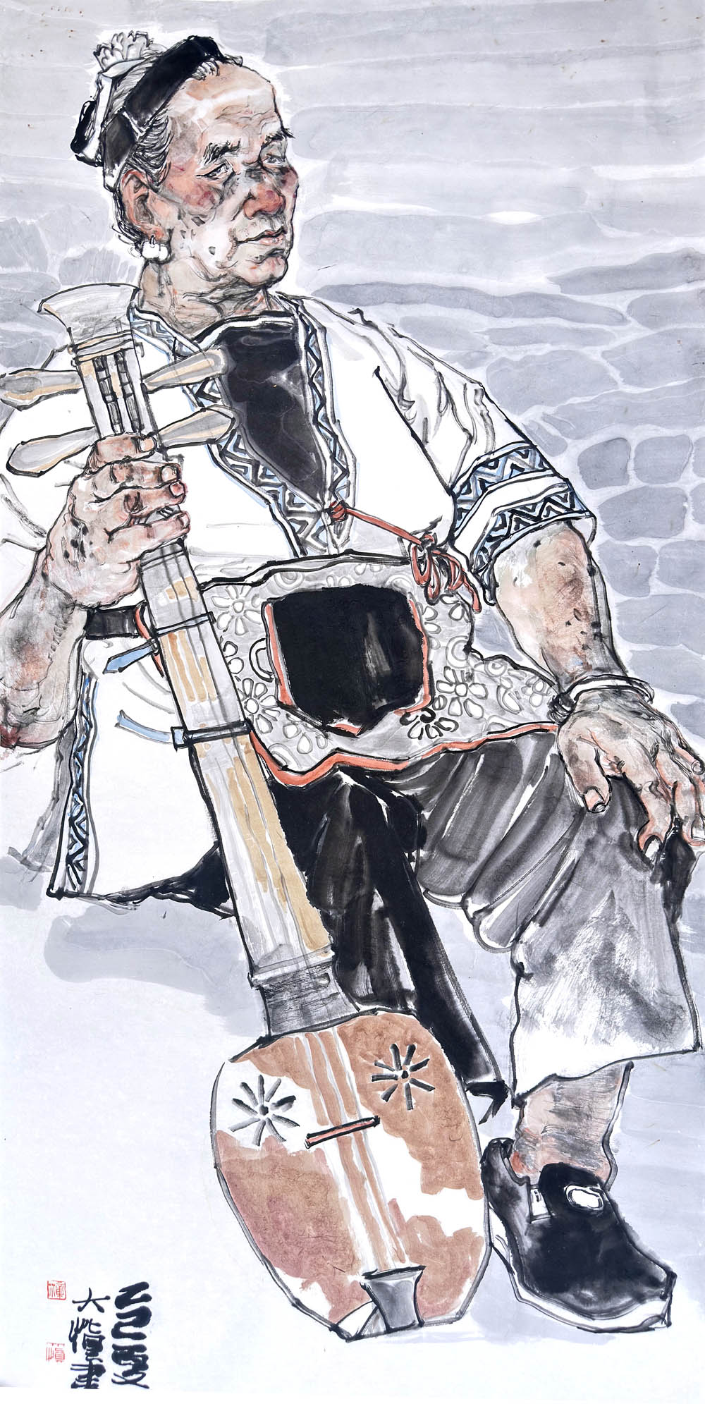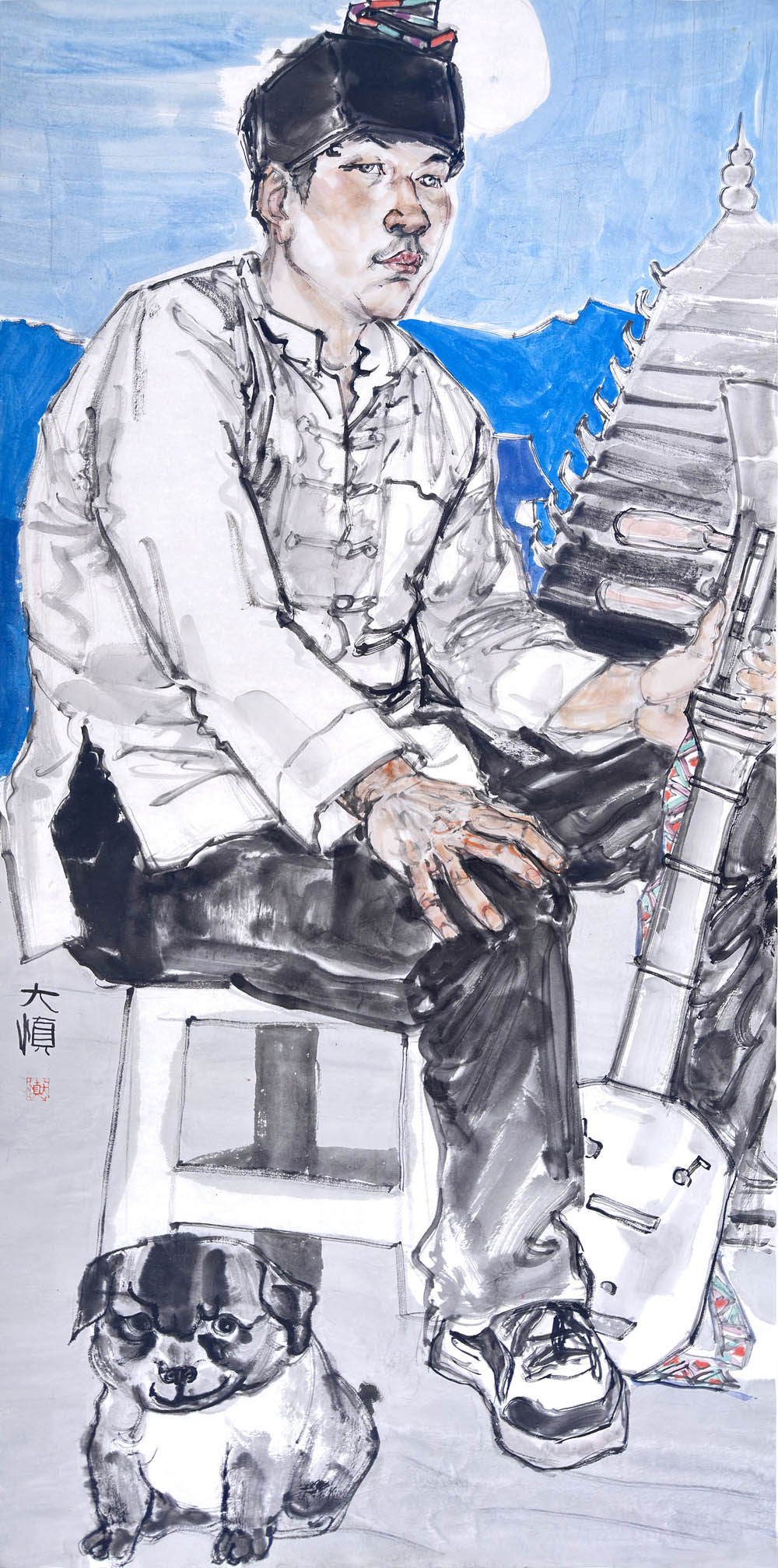 德國(guó)哲學(xué)家伽達(dá)默爾曾指出,真正的肖像畫并非對(duì)所表現(xiàn)人物的簡(jiǎn)單摹仿,而實(shí)際構(gòu)成對(duì)人物之存在的一種“擴(kuò)充”。因此,在人物塑造上,我們注重與寫生人物間進(jìn)行深度“對(duì)話”,由此既突破浪漫主義式的私人化表達(dá),也反對(duì)自然科學(xué)式的機(jī)械描摹,讓筆下人物的世界得以在作品中得到保存,讓當(dāng)下的獨(dú)特時(shí)代特質(zhì)得以被傳達(dá)。當(dāng)代性的融入絕非簡(jiǎn)單嫁接時(shí)髦元素,而是要在筆墨精神層面與時(shí)代對(duì)話。在寫生少女樂(lè)手時(shí),我嘗試用小筆細(xì)膩勾勒,同時(shí)又用章草般的筆法表現(xiàn)衣褶的流動(dòng),破墨過(guò)后線條如同被數(shù)字化時(shí)代切割的時(shí)間碎片,卻在整體構(gòu)圖中形成新的韻律。這種處理方式受到侗族大歌多聲部復(fù)調(diào)的啟發(fā)—— 不同時(shí)代的筆墨語(yǔ)言如同不同聲部,在碰撞中產(chǎn)生超越特定時(shí)空的藝術(shù)張力。