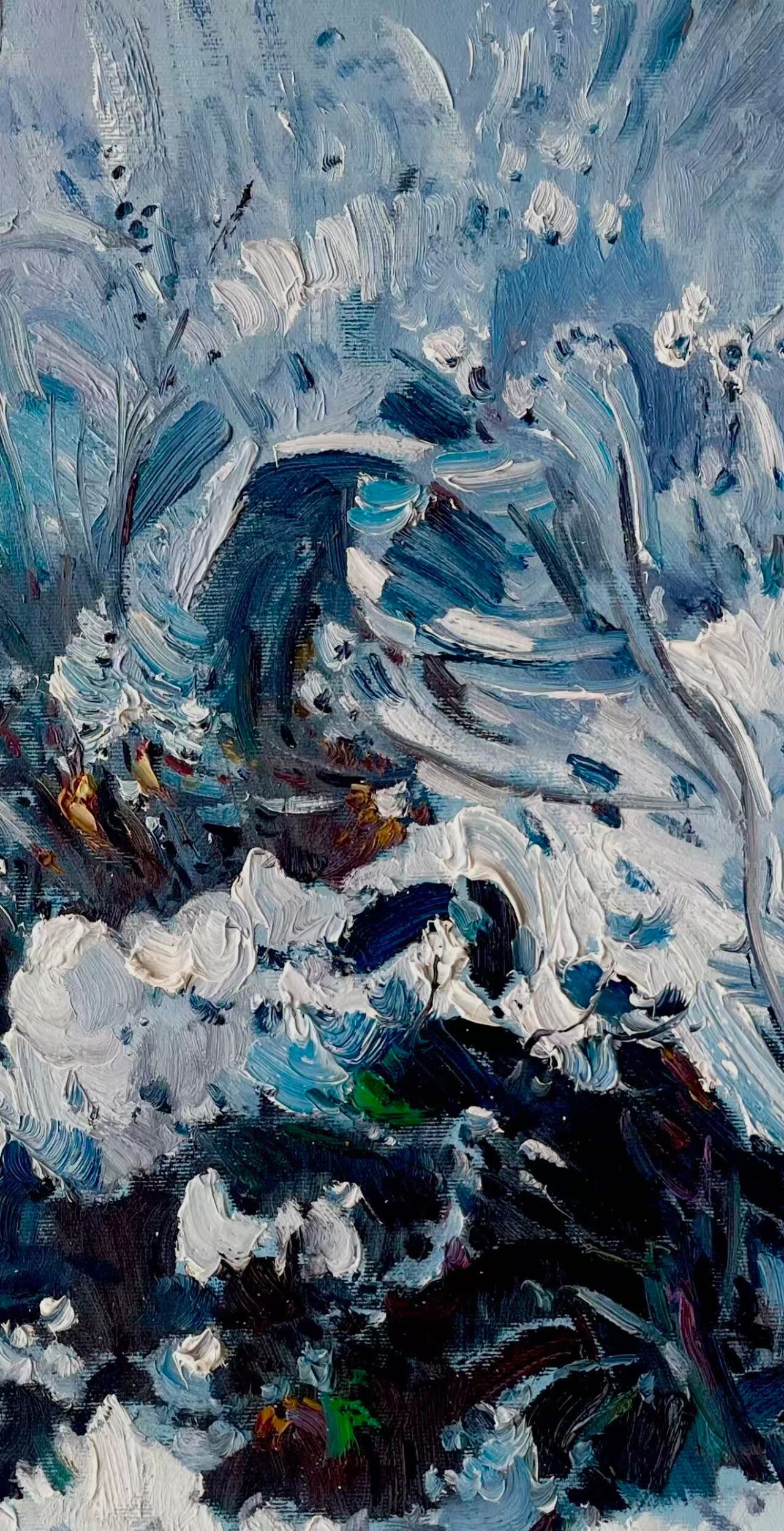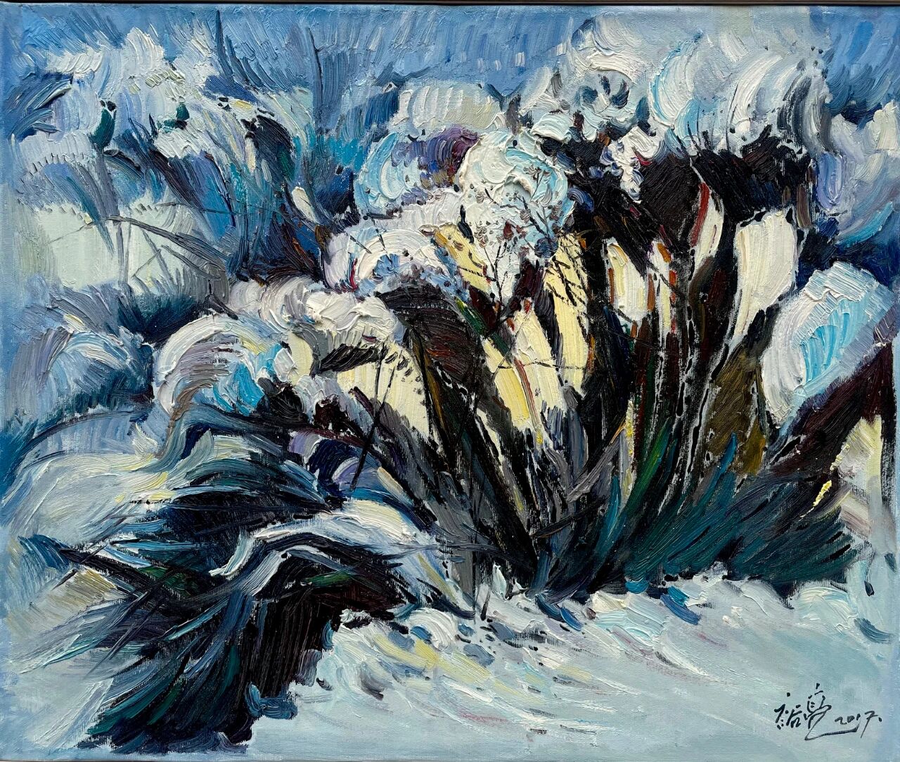 《冬雪后》以 “以小見大” 的藝術(shù)手法,將視角聚焦于雪地里的一叢小草。看似靜謐的雪景中,草籽深埋雪下,暗藏來年生長的生機(jī),恰是對(duì)生命力量的深刻詮釋。