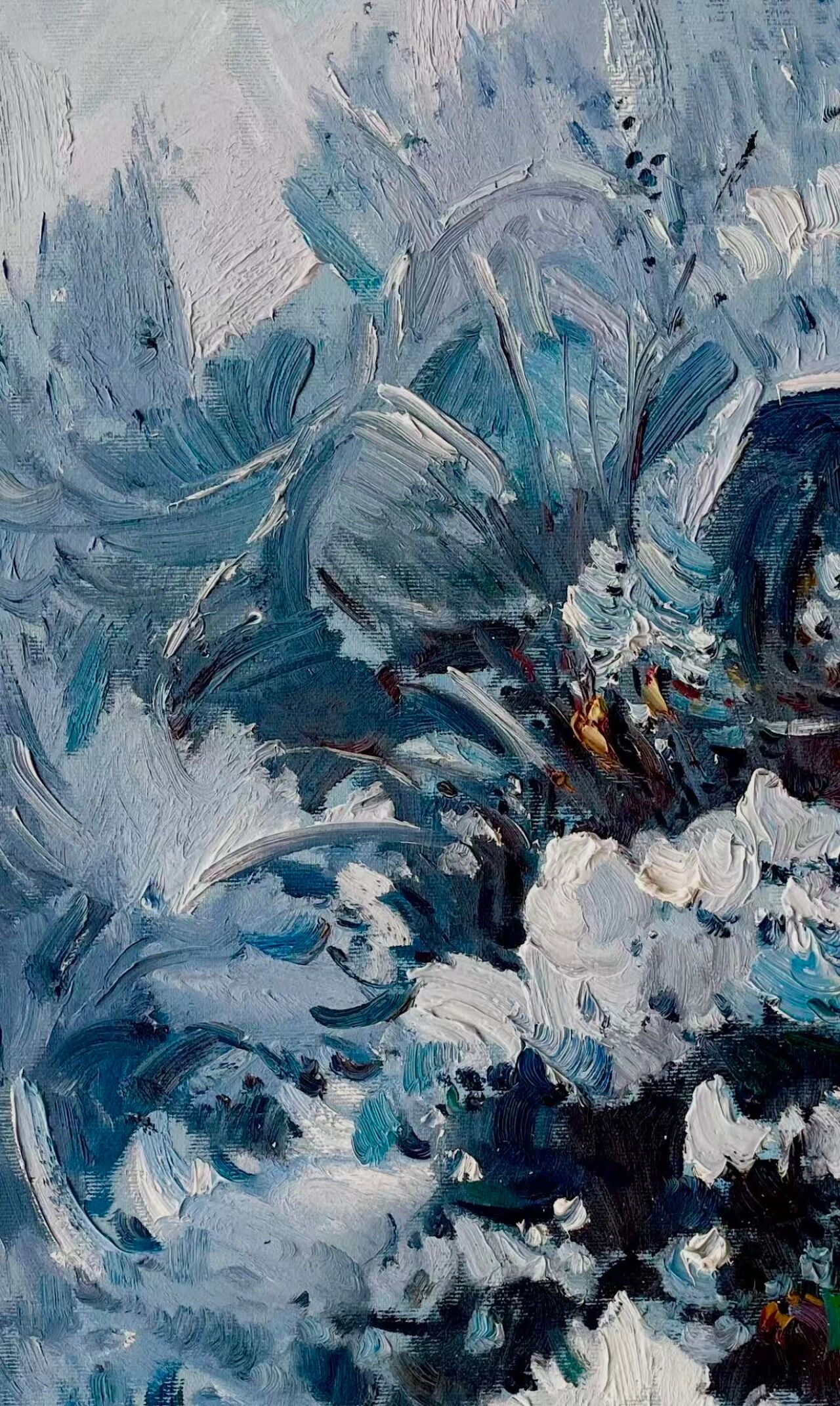 作品構(gòu)圖獨(dú)具巧思,形似孔雀開屏,以羽毛般舒展的筆觸將雪景鋪陳開來。這份構(gòu)圖設(shè)計(jì),既化解了宏大雪景難以具象表達(dá)的難題,更暗含著南方人初見雪景時(shí)的激動(dòng)與欣喜。