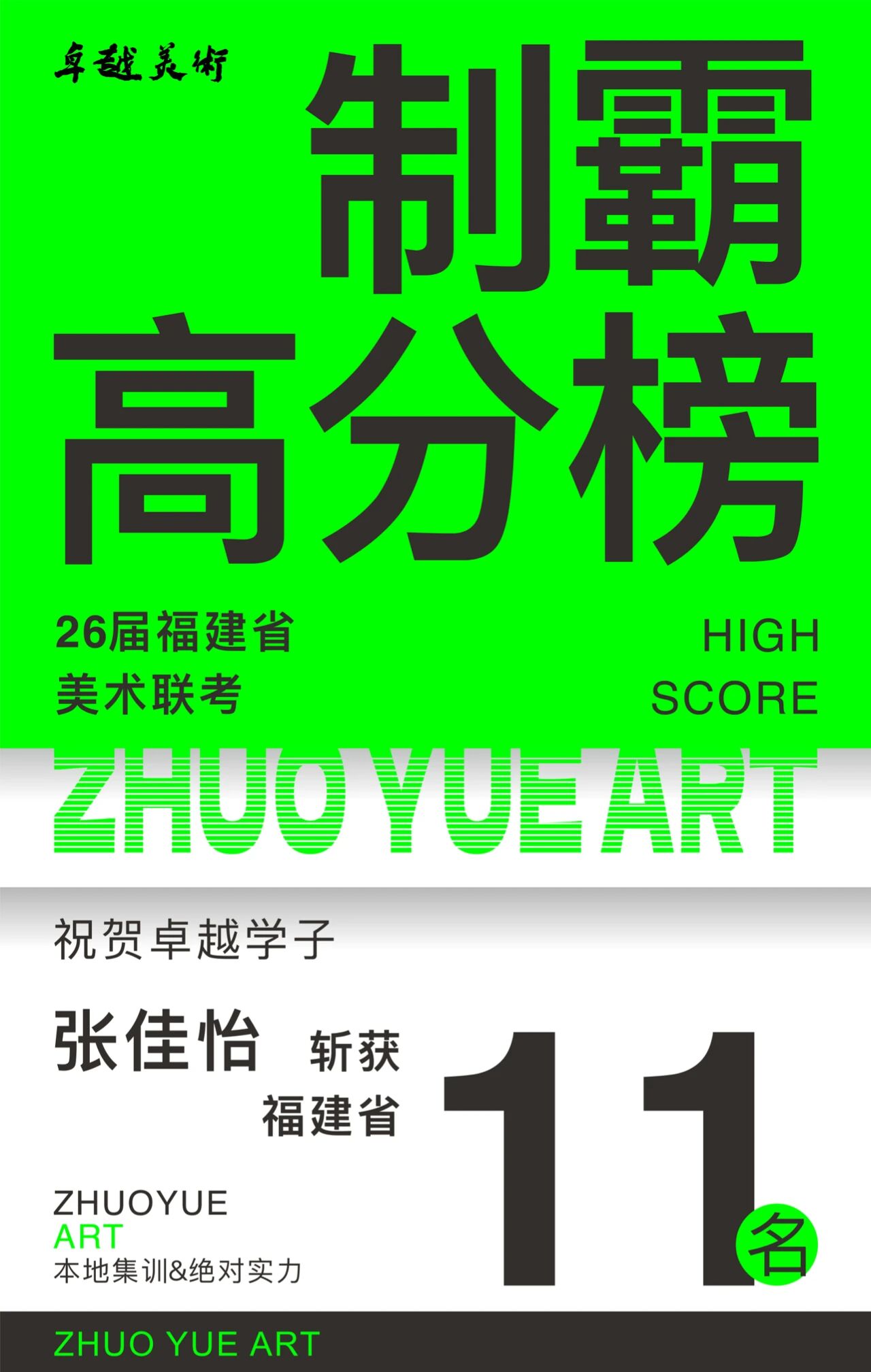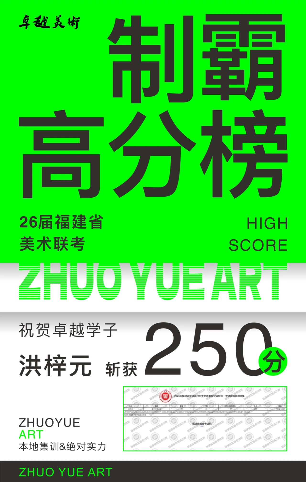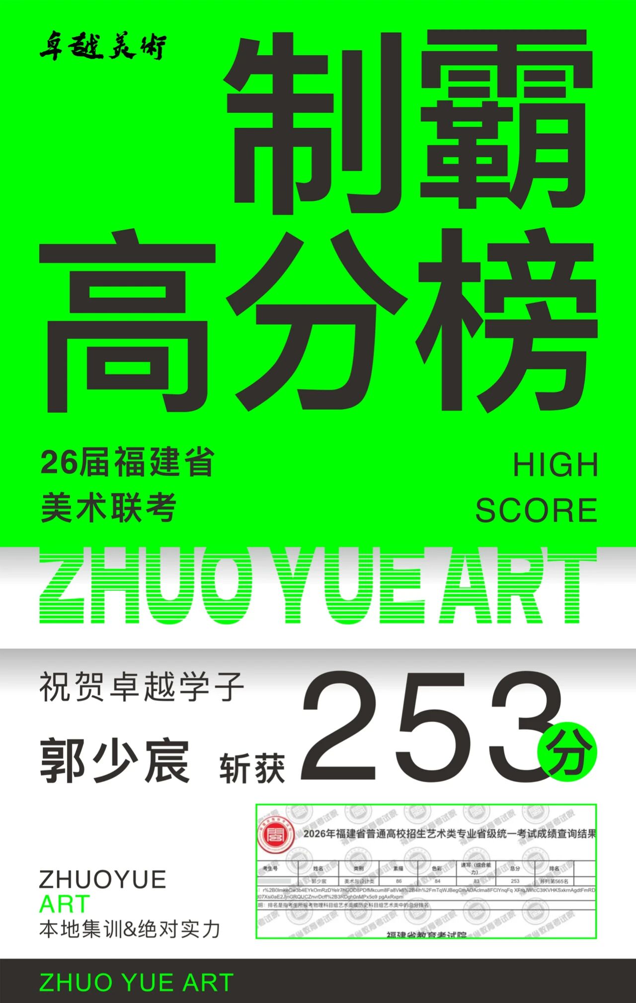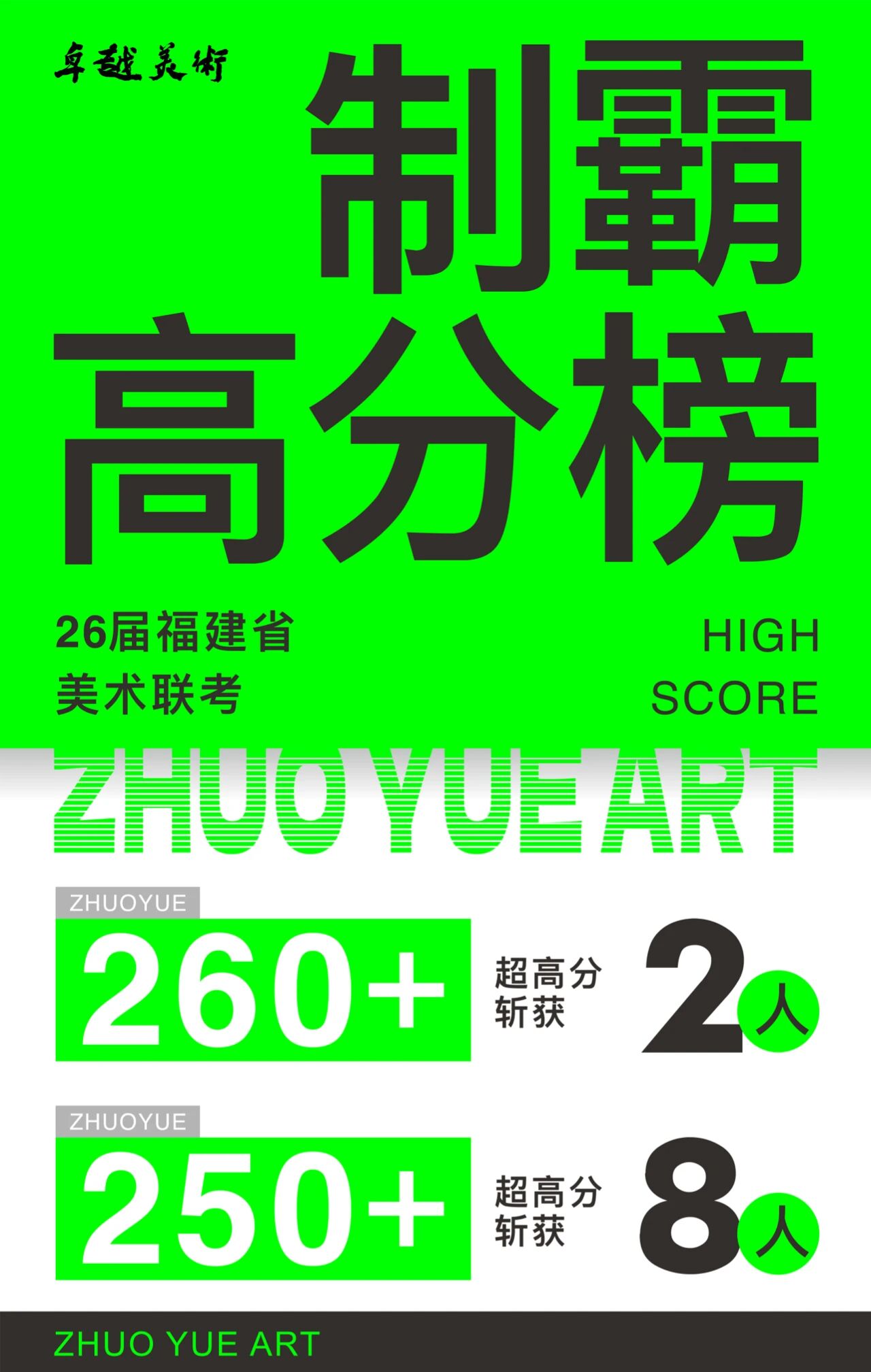 卓越美術(shù),漳州美術(shù)高考第一品牌,扎根漳州本土16年,屢獲佳績(jī)。 卓越美術(shù)攜手南風(fēng)藝術(shù)強(qiáng)強(qiáng)聯(lián)合,成立南風(fēng)藝術(shù)卓越校區(qū),始終保持初心,不斷深耕教學(xué),在全體師生的共同努力下,2026屆聯(lián)考成績(jī)打出了致勝王炸,卓越學(xué)子張佳怡、林妮可并列全省第11名,上260分2人,上250分8人,速寫(xiě)90分以上2人等優(yōu)異成績(jī);其中更有零基礎(chǔ)參加集訓(xùn)并獲得不錯(cuò)成績(jī):來(lái)自漳州立人學(xué)校洪梓元僅集訓(xùn)2個(gè)月考取250分;來(lái)自漳州英才學(xué)校楊芊銳考取250分;來(lái)自漳州八中楊晨考取241分等。面臨全省1.2萬(wàn)人考生的激烈競(jìng)爭(zhēng),這份成績(jī)來(lái)之不易,更是我們教學(xué)實(shí)力與學(xué)子努力的最好證明。 從2026屆開(kāi)始漳州籍考生,美術(shù)聯(lián)考考點(diǎn)就在漳州市區(qū),做為漳州籍的藝考學(xué)子更無(wú)需離鄉(xiāng)、花更多的費(fèi)用到外地奔波,而放棄本地優(yōu)質(zhì)資源和便捷性,卓越美術(shù)具有本地集訓(xùn)主場(chǎng)優(yōu)勢(shì),能為廣大學(xué)子提供更加優(yōu)質(zhì)的教學(xué)和服務(wù),下一個(gè)黑馬就是你,歡迎加入我們的卓越大家庭