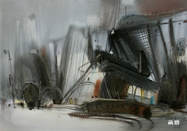 《都市行草·速生》以灰黑之調(diào),把色提升到一個(gè)十分穩(wěn)實(shí)的畫面,通過強(qiáng)調(diào)物象的疏密空間、虛實(shí)對(duì)比增強(qiáng)其視覺的冗雜效果,表現(xiàn)畫家對(duì)速生的城市膨脹的切身感受。畫面的黑、白、灰色調(diào)、筆觸的跳躍,抽象而迅速伸延的潑墨,皆構(gòu)成為和諧的沖撞,對(duì)簡(jiǎn)單線條破壞后的重組,營(yíng)造新的幻覺,以這種跳躍、冗雜的此起彼伏,闡發(fā)對(duì)現(xiàn)代社會(huì)高速運(yùn)轉(zhuǎn)的無奈。