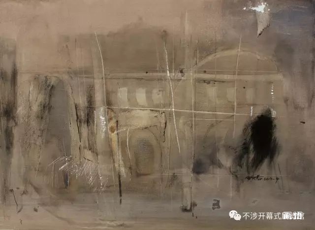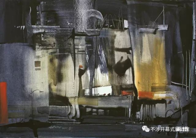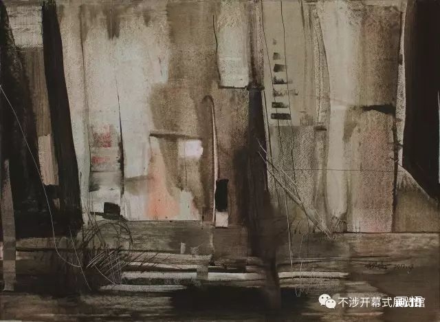 我想,姚波獨(dú)創(chuàng)的異于常態(tài)的技藝手法,及其帶有濃郁哲理意味的抽象筆意與色彩、肌理,正是其獨(dú)立于常態(tài)水彩畫之要因所在;其卓有成效的作品也在切實(shí)地踐行著他“藝術(shù)除非有味道、有感染力,否則思想等于零”的創(chuàng)作理念。這在水彩畫長(zhǎng)期囿于經(jīng)驗(yàn)雷同的水情水趣“水分泛濫”色澤輕飄之俗套的今天,堪為一面可鑒之鏡。