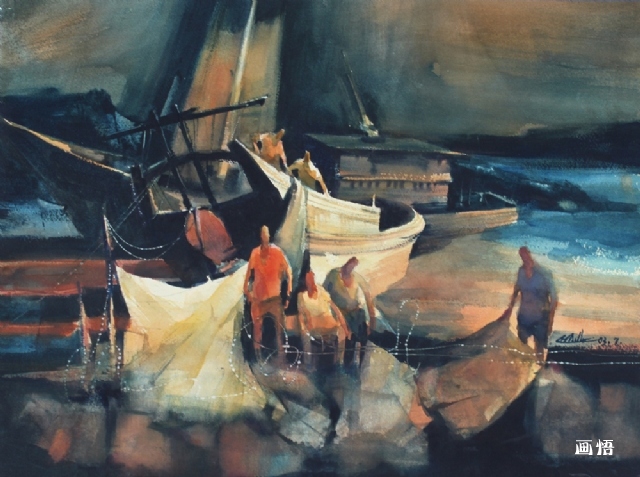 《漁歌唱晚》54.6x41cm 水彩2003首屆全國小幅水彩畫展 2003