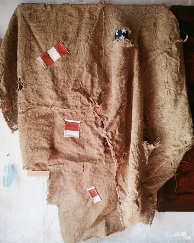 麻布口袋,當(dāng)藝術(shù)家朱新戰(zhàn)發(fā)現(xiàn)這些破損的廢棄物時(shí),想也沒(méi)想全部買下。麻布的色相與質(zhì)地與黃土地太類似了,而藝術(shù)家正在“補(bǔ)丁”的概念里縫補(bǔ)他的視覺(jué)。不需要所謂的靈感,一個(gè)藝術(shù)家成天滿腦袋都是藝術(shù)思考時(shí),創(chuàng)想源源不斷,所謂靈光一現(xiàn)的詞匯就獻(xiàn)給機(jī)會(huì)主義的投機(jī)份子吧!