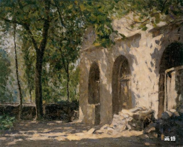 靳尚誼《綠蔭下的窯洞》45×55cm-1990-紙板油畫
