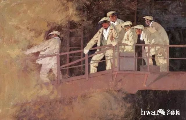 這一段時間很短,實際上只是從1963年到1966年的三年。那時剛工作,很興奮,一肚子想法想實現(xiàn),光1964年就畫了近十幅,作著不同的嘗試,有《毛主席在北戴河》、《出鐵》、《爐前工》、《守場》、《送奶車》、《義務交通員》、《通過暴風雨前進》、《送情報》等,都有著清楚的為政治服務的烙印。藝術語言方面雖有嘗試,也吸收一些中國傳統(tǒng)繪畫的意趣,但都還是“全原素”的作法,具體的時空條件下的光色關系,仍然是運用的主要手段。因為在吸收方面模仿更多些,因之顯得較“生”,招來了一些熟人的諷刺:“呵!老妥搞民族化啦!”我當時感到象阿Q挨了假洋鬼子的棒似的,但還沒什么不愉快,倒思考思考人家意見的所在,確實還有好處,以后簡單化就少了??上菚r的畫除《出鐵》、《爐前工》外,都到哪里去了,始終想不起來了。
