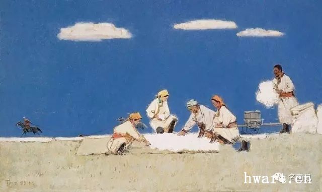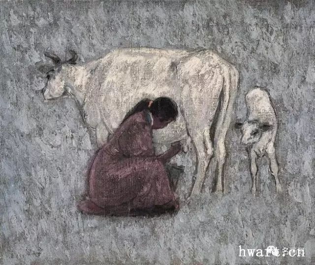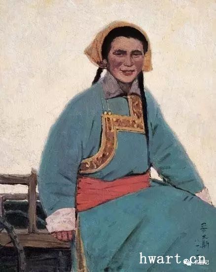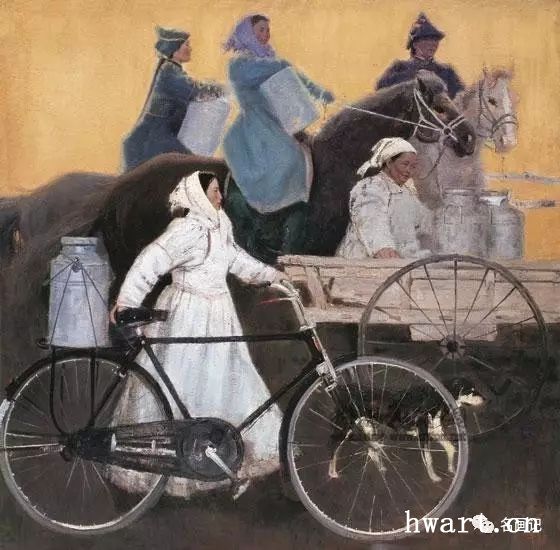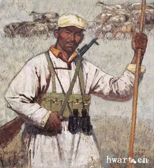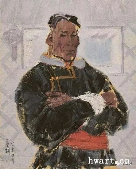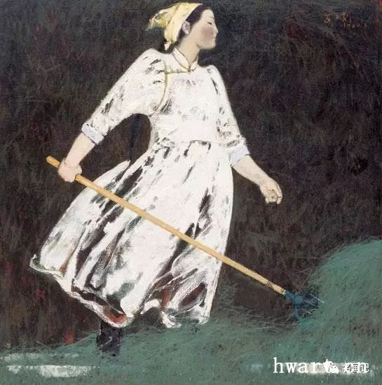 《垛草的婦女》是1984年全國第六屆美展獲銀質獎的作品,背景是有些草形的深綠色底子襯托大塊的白色衣服的人,沒有光影關系。當時畫靴子時膽子小了點,如果畫成白色的或近于白的淡色,整體效果會更好的。最后想了個補救辦法,在畫面下方,也就是拉草車確實存在的那根白樺木橫桿,被補畫上去。那雙黑色馬靴沒服從光影卻服從了生活的真實。