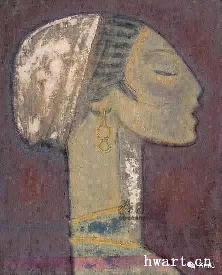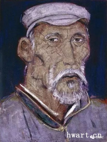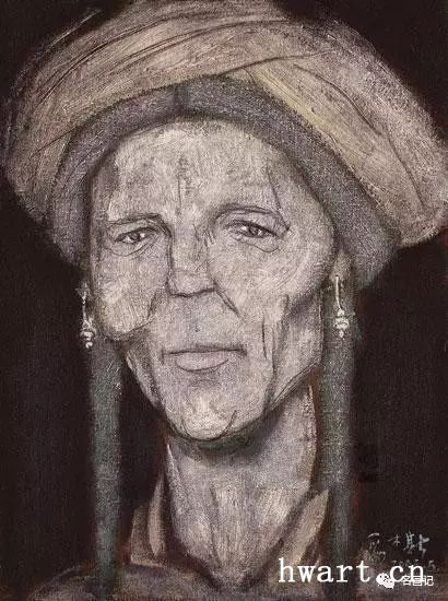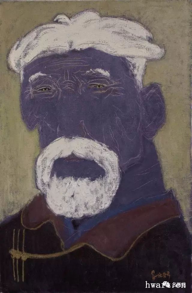 開始了綜合技法的運用,但還是用油畫顏料完成,辦法多了些,沒有對畫面上粘貼什么發(fā)生興趣。新出了些金、銀等顏料,還有丙稀,都試著用,摻和著使,離光影效果更遠了些。象參加全國十屆美展的《老人》就是,還有《年輪》、《矚》、《婦女像》、《藍鬃白馬》等,所畫內容沒什么變化,因為我還不想畫別的。