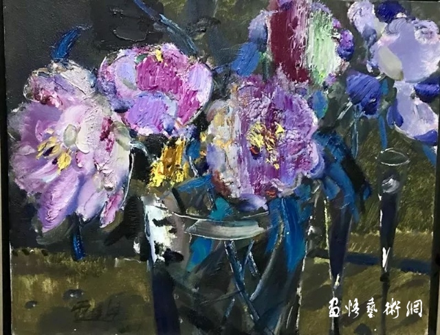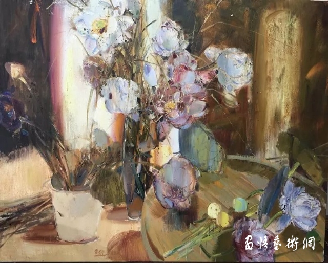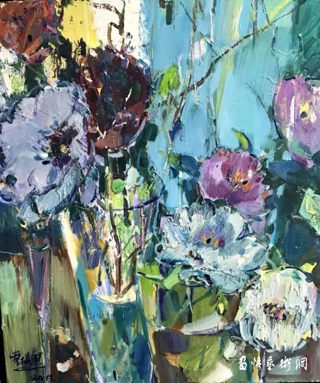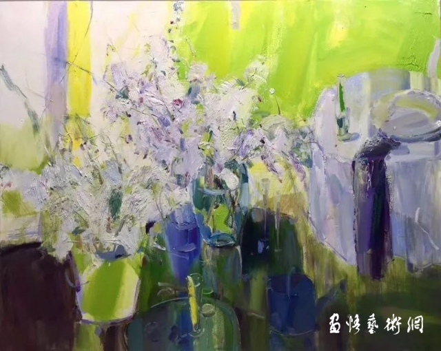 管樸學(xué)的靜物畫,跳出了一般靜物畫再現(xiàn)物件的靜態(tài)之美。她似乎并不在乎畫的是什么花,用的是那種器皿,只在乎這些實(shí)物,在“光”這位魔術(shù)師的導(dǎo)演中,舞動著、跳躍著、閃爍著,此時(shí)此刻在交錯變化的時(shí)空中,樸朔迷離的幻影中,是開啟了她人生體驗(yàn)的感悟,還是觸動了她的某種情感的琴弦,給了她倏忽而來的靈感。讓她迫不及待地?fù)]舞畫筆,飽蘸著情感的色彩,滿懷激情,去營造心中的美麗圖景。她舍去造型中理性的透視規(guī)則,用平面構(gòu)成,隨著心脈的搏動,情感的起伏,痛快淋漓地將色彩的色相、明度,冷暖的差異,構(gòu)成了畫面的基調(diào)。她并不表現(xiàn)器物的質(zhì)感和體量感,來自物體自身的的光,來自結(jié)構(gòu)的光,通過氣的穿行彌漫,畫面有了“呼吸”感。光影攪動了畫面空間秩序,營造著她那樸朔迷離的幻覺空間,借光的作用把個(gè)靜態(tài)的畫面轉(zhuǎn)換為動態(tài)之景,用她那靈動的筆觸,瀟灑的刀痕、斑駁的色塊,生動的肌理,構(gòu)建出了一個(gè)個(gè)自然天成的妙境?!墩纭?、《夜荷花》同樣是藍(lán)綠調(diào)子的畫面,一個(gè)是在荷花淀中閑讀的少女,雖畫面散淡,依然有股清氣流動。后者則是在夜色中,那些堆放一起的晶瑩玲瓏的玻璃器皿,用自身的反光,在夜色中互相爭輝,惟有一簇白荷,鶴立雞群聳立其中,顯現(xiàn)雍容閑雅的華貴。《夜荷花》、《紅荷》、《七月七》中晶瑩剔透的玻璃器皿,它們似乎與花草、背景互為映照混沌一體,但你可仔細(xì)地辯認(rèn)發(fā)現(xiàn),它們被那細(xì)細(xì)的弧線、直線,勾畫出了瓶罐的邊線,讓你仍可辯認(rèn)每個(gè)瓶、每只杯的形態(tài)和那瓶中水還有多少。就這些不易被察覺的時(shí)斷時(shí)續(xù)、時(shí)隱時(shí)顯的線,恰似生命的呼吸,跳動著生命的脈搏。人們在她那種粗中有細(xì),狂放中隱含著溫婉的筆意中,在那些飄忽不定形象中,在朦朧迷離的畫面中感受到一種堅(jiān)韌、強(qiáng)勁的生命活力,一種激情昂揚(yáng)的精神氣息。這是怎樣一位激情豪邁的女性?