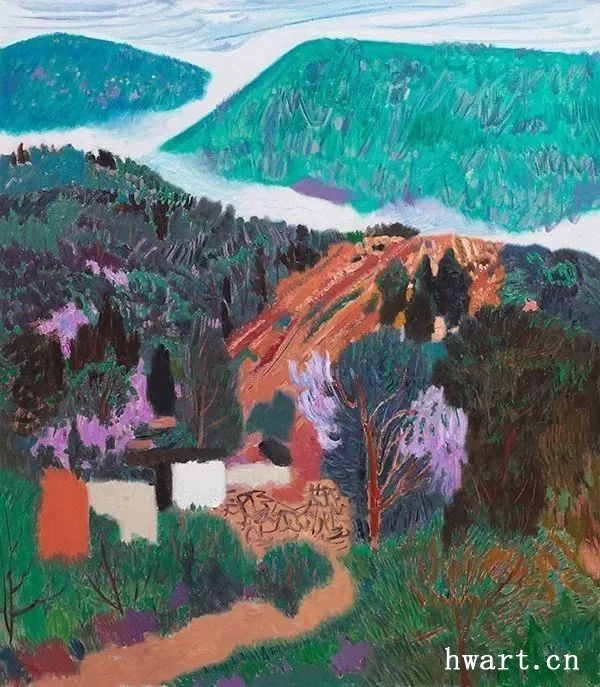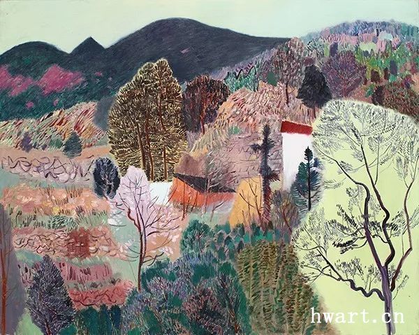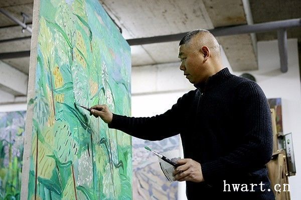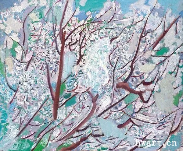 他的一幅《蘋(píng)果花叢聽(tīng)蜂鳴》,采用仰視的視角,給人一種撲面而來(lái)的氣勢(shì)。枝干的蟠曲遒勁,花朵的濃淡深淺,筆觸時(shí)而密不透風(fēng),時(shí)而疏可走馬,時(shí)而描繪具象的細(xì)節(jié),時(shí)而平涂緋紅的模糊一片,表現(xiàn)著被蜂群震動(dòng)的感受。虛實(shí)的對(duì)比,遠(yuǎn)近的對(duì)比,色彩的對(duì)比,層次的對(duì)比……他用色彩吶喊出聲音,用平涂抽象表現(xiàn)出震顫,畫(huà)布上處處流動(dòng)著芳香的節(jié)奏,筆筆觸動(dòng)著春的氣息,這是春天的交響樂(lè),春天的昂揚(yáng),春天的希望。