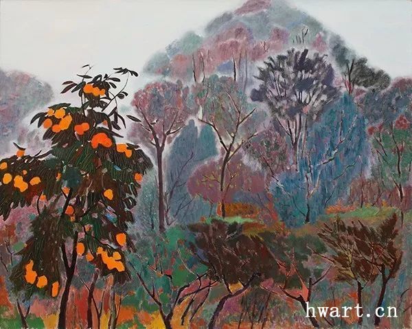 “以我觀物,故物、我皆著我之色彩?!痹谕蹩伺e先生這里,自然的萬(wàn)物被賦予新的色彩、結(jié)構(gòu)、空間,他筆下的山川、平原,他的樹(shù)木、果實(shí),是真山真水,野樹(shù)山花,不是點(diǎn)綴文人案頭的湖石,不是窗前嬌嫩的瓶花。他所擷取的,是來(lái)自大自然的造物,是經(jīng)過(guò)時(shí)間磨礪過(guò)的山水,野生野長(zhǎng)、充滿(mǎn)生命力的活潑潑的自然之物。更主要的是,在他的畫(huà)筆下,自然之物被賦予了豐富的性格,有的歷經(jīng)滄海、孔武有力,有的繁花似錦,生機(jī)勃勃。月映萬(wàn)象,從另一方面,也折射出王克舉先生的英雄情結(jié)與美好情愫。