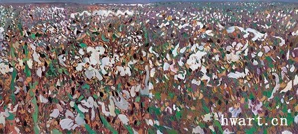 已入深秋,下過(guò)霜了?;ㄒ呀?jīng)被花農(nóng)撿拾了大半,只剩零零星星的一些。經(jīng)霜后的花,葉子蜷縮著。然而,清晨的天際是灰蒙蒙的調(diào)子,反襯著土黃色大地上的星星點(diǎn)點(diǎn)的白,這白點(diǎn)綴在深秋的曠野中,宛如璀璨的星空,遙遠(yuǎn)的銀河系。王克舉先生的內(nèi)心被觸動(dòng)著,將眼前的花,幻化成畫(huà)布上的一片花的銀河,花的宇宙。