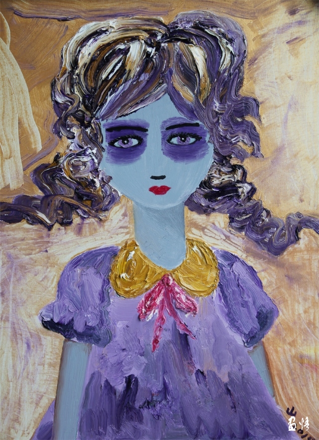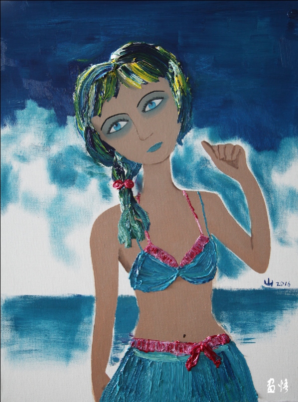 崔治中:山山的作品多以人像少女為主,以大塊矛盾的色彩構(gòu)成濃烈的視覺沖擊,其主體展現(xiàn)了女人的“少女面”、“情愫畫像”等一體多面,有著雅拙、樸素的的特征。