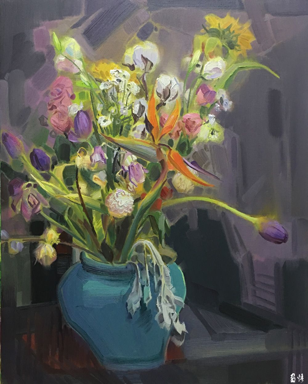 2014-2015年在中央美術學院油畫進修班進修,師從丁一林教授、李延洲教授、王漢英老師、馮杰、路昊老師。放下內心,追求本真。以圖像的方式敘述著心中的社會和民生,表達個人對現實問題的關注與思考。他在自己子女擇業(yè)、工作、生活等狀況所呈現的彷徨迷惘時,回想到自己當年徘徊和困惑的情景,所以在《青澀時代》系列油畫創(chuàng)作過程中,試圖運用油畫語言和構成空間的解讀,進行自我內心對話和探示的一種訴說形式,詮釋自己的青澀之夢