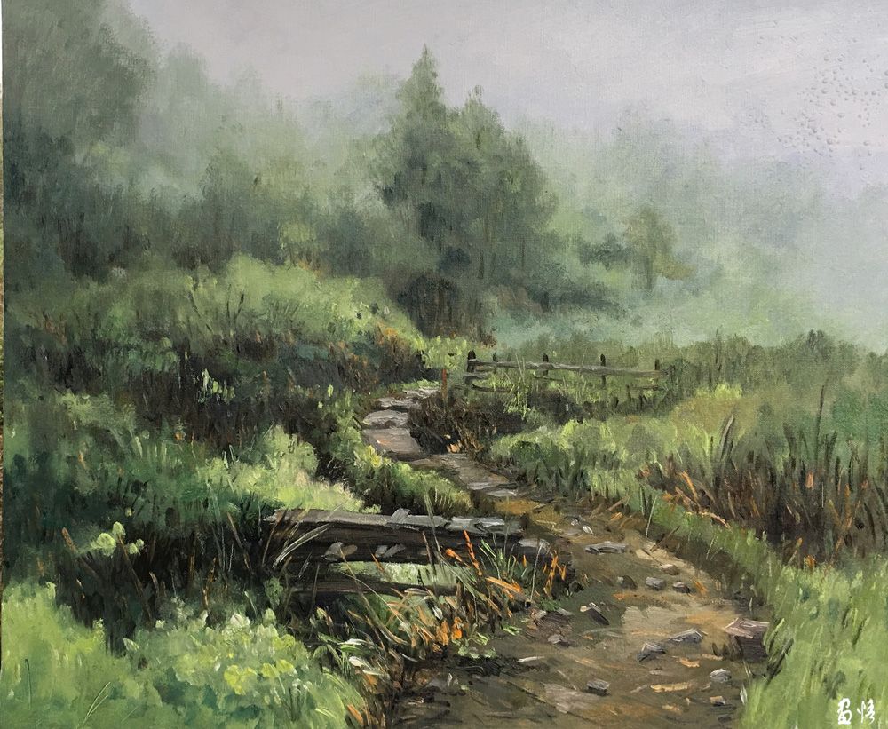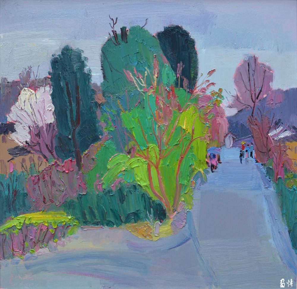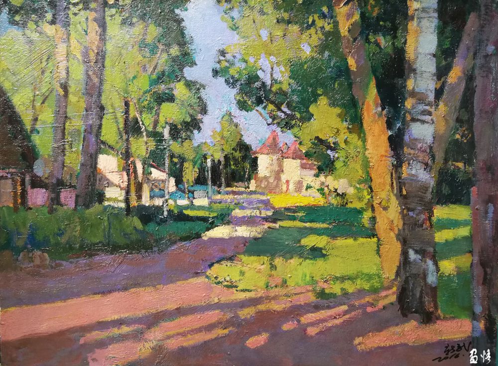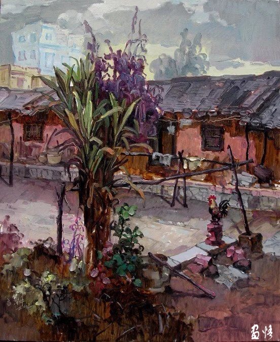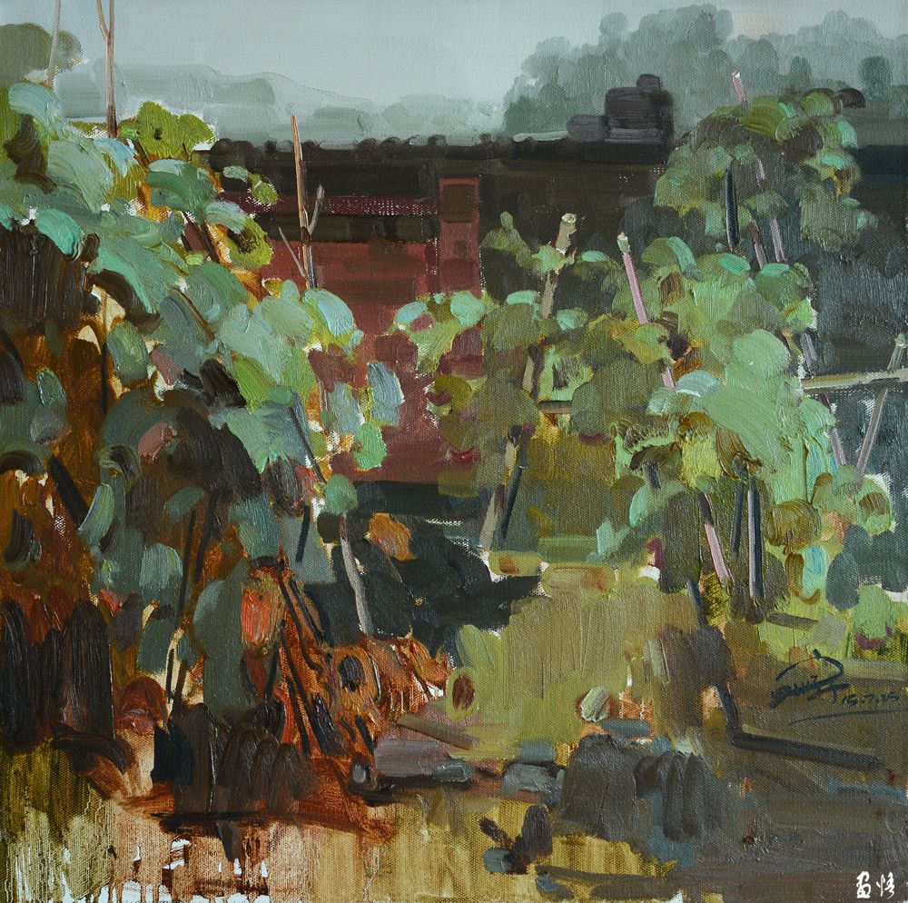 蔣建智的油畫作品主要是偏表現的鄉(xiāng)村風景,畫家沒有描繪客觀的真實,而是捕捉畫家自身的心理感受和色彩感覺,色彩斑斕,用油彩恣意抒寫著新水墨的語境,色彩斑斕。表達自己面對自然產生的心象世界。在探索油畫民族化的過程中,蔣建智合理結合中西情調,大膽的運用中國畫或傳統(tǒng)藝術的形式,使自已的作品以農村的題材形成詩一般的田園風光。作品撲面而來的是恬然嫻靜和純樸原味的鄉(xiāng)土氣息,承載著某種思念的情愫,讓人浮想聯翩。