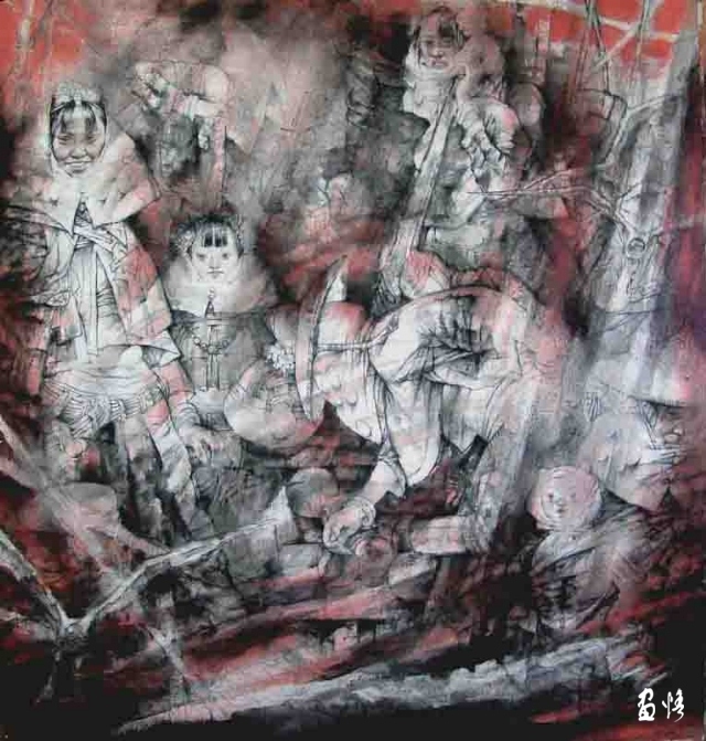 第三,趙勝利作品的這種“中國精神”還體現(xiàn)為他的作品總能恰到好處地拓展了水墨人物畫的當(dāng)代意識。他對當(dāng)代文化語境的通透了解,他在創(chuàng)作領(lǐng)域中的自主性和獨(dú)創(chuàng)性,使他的作品展現(xiàn)出鮮明的、獨(dú)屬于當(dāng)下的時代風(fēng)格。有著悠久歷史的中國水墨畫在當(dāng)代的發(fā)展是一個嚴(yán)肅而重大的課題,這個課題的核心包括兩個相輔相成的方面,一是如何從水墨的語言系統(tǒng)內(nèi)部演繹并發(fā)展出具有今天文化屬性又有個人特征的話語,一是如何用水墨的方式表現(xiàn)與今日生活相關(guān)的現(xiàn)代觀念。在水墨人物畫領(lǐng)域,這個任務(wù)更為迫切,因?yàn)檫@方面的傳統(tǒng)相對于山水和花鳥來說是不足的,相對于今日現(xiàn)實(shí)世界給人豐富的感覺,水墨語言在表達(dá)上似乎顯得蒼白無力。為此,近20年來,許多畫家懷抱承繼傳統(tǒng)、開拓進(jìn)取的志向,在這個課題上投以持續(xù)的努力,使得當(dāng)代水墨藝術(shù)呈現(xiàn)出多樣發(fā)展的態(tài)勢,水墨人物畫也有了彌合傳統(tǒng)與現(xiàn)實(shí)的創(chuàng)造。在這方圖景中,顯然,勝利兄是探索者中的的一員,他從上世紀(jì)80年代以來的二十多年的水墨探索,就是一個使水墨語言與當(dāng)代現(xiàn)實(shí)感受逐步融洽并逐步建立起自我風(fēng)格的過程。