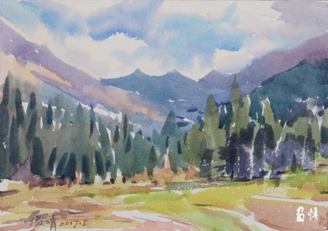 在他的畫筆下,天山云遮霧繞,有時(shí)候神龍見首不見尾;有時(shí)候讓我們想到了梁羽生筆下的《七劍下天山》,俠客之風(fēng)余韻猶存;有的看起來那么富有詩意,使我們想到了《穆天子傳》記載……3000年前的周穆王曾乘坐“八駿馬車”西行天山,西王母在天池接見了他。我們仿佛在觀看他的畫作時(shí),看到了穆王親書的“西王母之山”中的奇珍異寶。