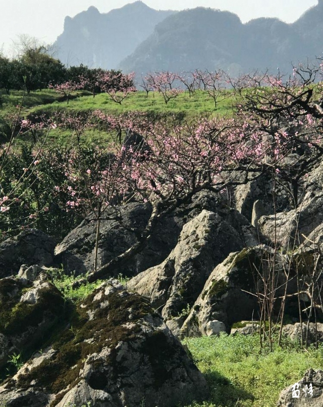 澧水春暖,桃花如期盛開。撲入眼簾的色彩令人迷醉,山野小園、青山翠谷皆是錦色如天。如星星般散落著的桃紅盈滿了山坡。一片片桃林,被青灰色的山石掩映著,彎彎曲曲的枝干似國畫中的枯筆,勾勒的蒼勁而有力。腦海里《詩經(jīng)》惟美的詩句跳了出來,“桃之夭夭,灼灼其華”。這些可愛的桃花仙子,真真的美艷動人。