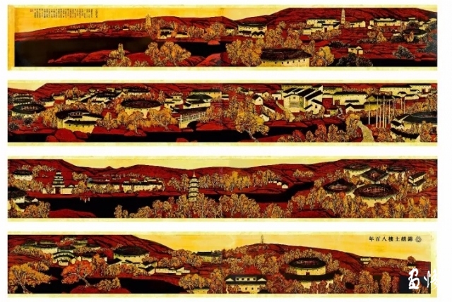 《錦繡土樓八百年》則真切地表達(dá)了本人對(duì)鄉(xiāng)村生活的留戀和感激,不是以旁觀者的身份出現(xiàn),而是身處其中。以溫暖,熱烈,秋陽(yáng)下的綿延不斷土樓群落——紅色的土樓、黑色的溪流、白色的旗桿和諧地融為一體。通過(guò)畫面采用別具一格的中國(guó)古代手卷式構(gòu)圖手法,融入了本人的主觀情感與人文情懷,追求漆繪畫語(yǔ)言的完善與個(gè)人圖式的建構(gòu)漆畫作品,用漆抒寫意趣,抒發(fā)情懷,同時(shí)強(qiáng)調(diào)整幅作品秩序感,讓人感覺(jué)渾厚方正,舒展大氣;把鄉(xiāng)土性質(zhì)和時(shí)代變遷二者之間的關(guān)系進(jìn)行了認(rèn)真的梳理,沒(méi)有矯揉造作,沒(méi)有故弄玄虛,在繪畫性方面注重漆特性的表現(xiàn),將源遠(yuǎn)流長(zhǎng)土樓的神韻得到了充分的彰顯。讓人聯(lián)想到鄉(xiāng)愁的美好,未來(lái)的希望,喚起人們對(duì)生活的熱愛(ài)。