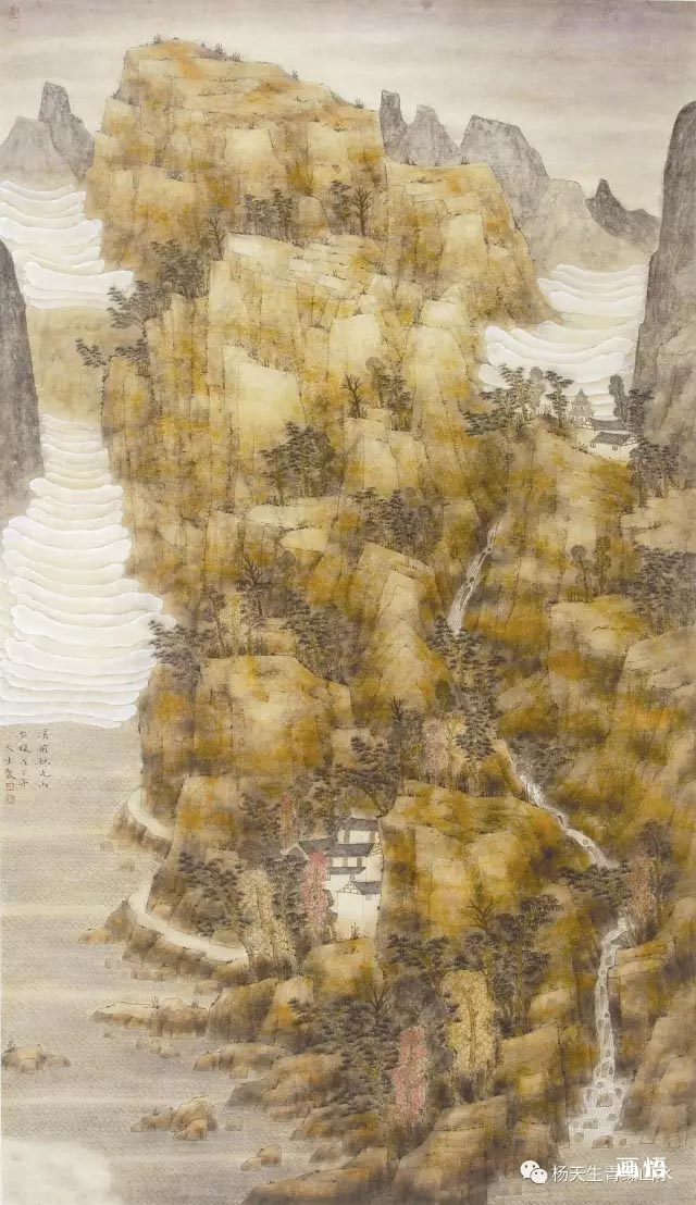 楊天生山水畫芻議◎●高鴻家山云霧縹緲間。家山在夢里。經(jīng)過篩選過濾的家山底色,早已褪去蔥蘢蒼翠與火氣的喧嘩,在沉寂中沉淀,在舒緩的筆觸里抵達,在心靈的宕逸中凸顯。這是楊天生近期山水畫留給我們咀嚼不盡的余味與感傷。經(jīng)歷。帶給人們以凄美。冷艷。帶給我們以驚悚。世事滄桑,物是人非。家山的模樣在悠忽中定格。如果說二十一世紀的社會變革與工業(yè)革命的浪潮帶來的物質(zhì)膨脹,導致精神的匱乏與思想的蒼白,那么,急劇的生活節(jié)奏與無止境的欲望擴張無論從領(lǐng)地還是從心境都帶來了前所未有的沖擊。于是,人類的生存空間變得十分的嚴峻與難以折合。家山深黛的墨綠在推土機與煙霧的繚繞中泛黃變色,植被在現(xiàn)代工業(yè)的往復挖掘中裸露了她的胴體與血脈,流失的是砂礫與水土,牽扯的是游子萬劫不復的思鄉(xiāng)情結(jié)。家山,凝結(jié)成一種思緒,一種詩性的向往。即便褪色,家山的模樣依舊帶著神圣的蔥郁。《溪前春光山乍暖》滿目青山過濾成飄渺的黃昏意象。流云蕩逸其間,黑瓦素壁,民屋數(shù)椽,流泉在山道中蜿蜒,雜樹錯落其間,天幕低垂,暮色蒼茫,偶有梵音掠過……畫家在默默地詮釋著生命的靜美與廣袤原野的蒼涼?!吧锄t翔集,錦鱗游泳”那豪氣干云的萬千氣象已凈化為萬頃波平微風蕩漾的詩意棲居之所。